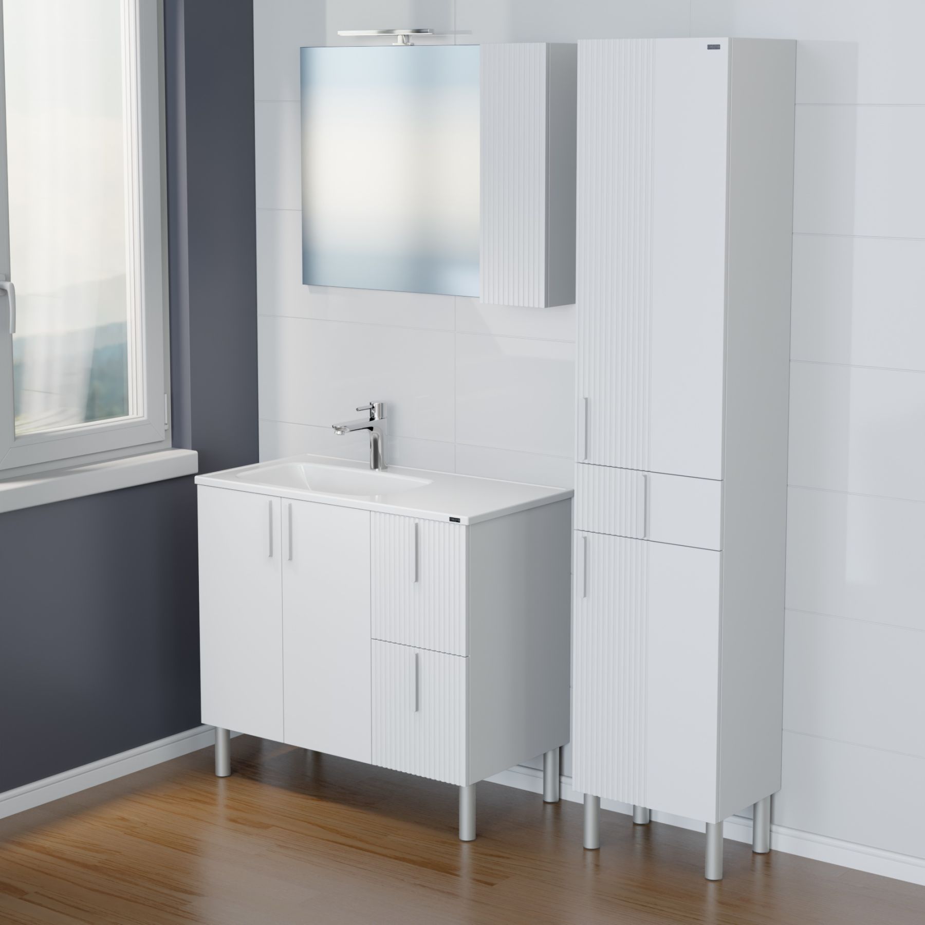 Фасады и боковины выполнены из МДФ и покрыты глянцевой эмалью. Её дверцы оснащены петлями плавного закрывания, а ящики оборудованы доводчиками нижнего монтажа. Ящики отличаются стильным дизайном, они выполнены с вертикальной реечной фрезеровкой.