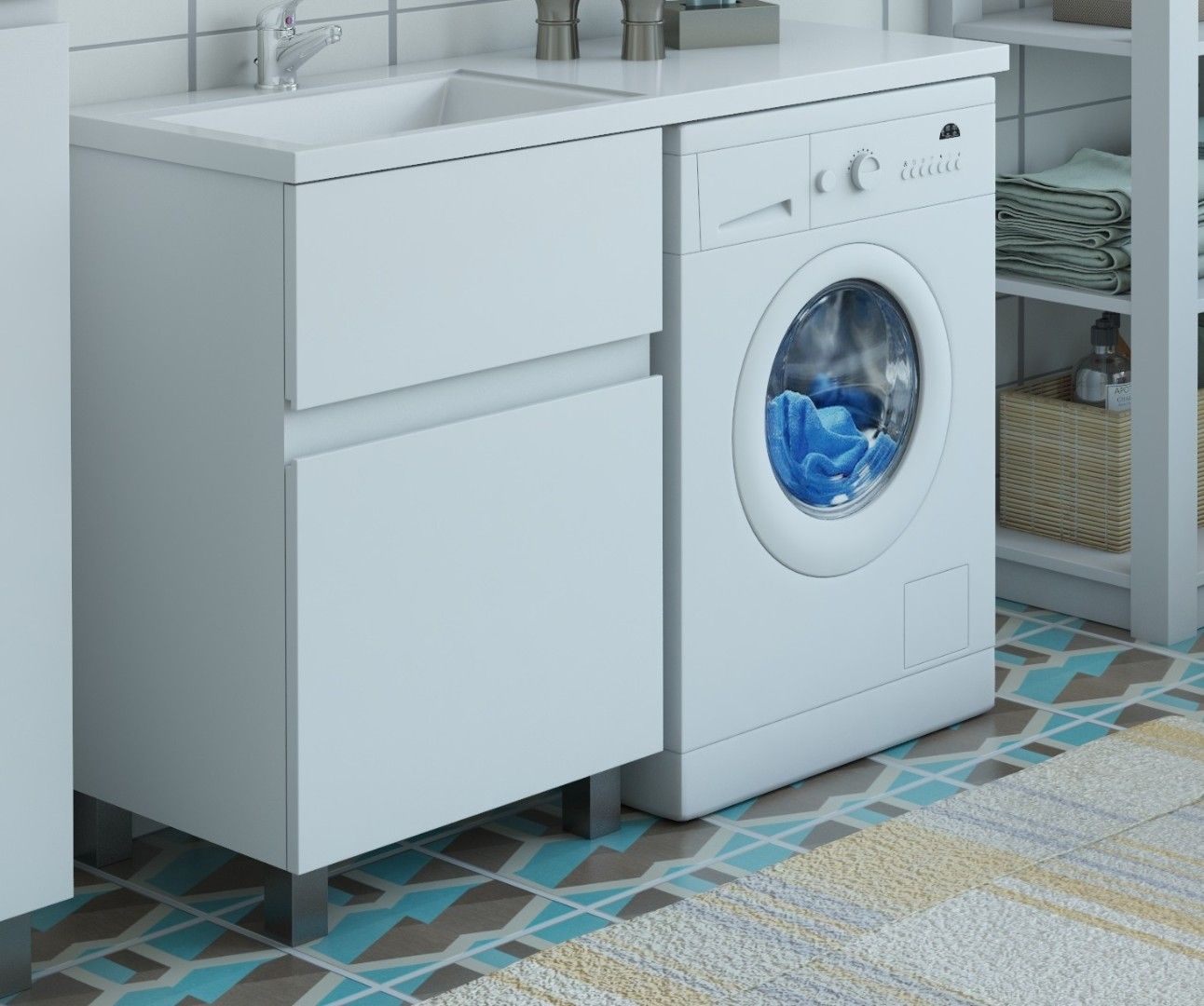 Коллекция мебели для ванной комнаты Dallas Luxe покоряет своей удивительной простой и функциональностью. Стильная лаконичная тумба, укомплектована раковиной из литьевого мрамора с удобной чашей. Стиральная машина устанавливается под столешницей, за счет чего экономит место в ванной комнате. В тумбе имеются два ящика. Нижний ящик тумбы – широкий и вместительный – предназначен для крупных предметов, а в верхнем имеется специальная организация пространства, позволяющая хранить мелкие вещи.