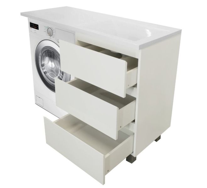 Приоритетом в выборе тумбы с раковиной является площадь ванной комнаты. Функциональная тумба с тремя ящиками решит вопрос для большинства покупателей. Тумба укомплектована раковиной из литьевого мрамора с удобной чашей, стиральная машина устанавливается под столешницей. Три ящика позволят распределить как крупные, так и мелкие вещи.