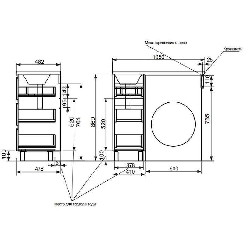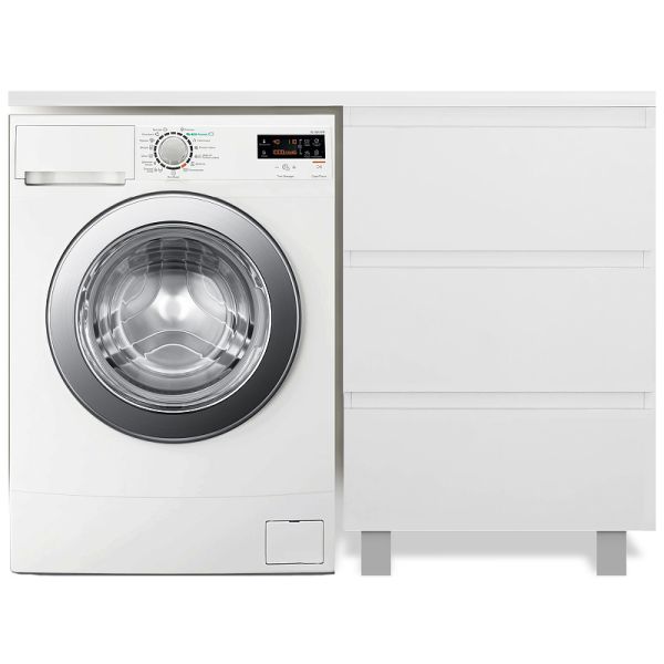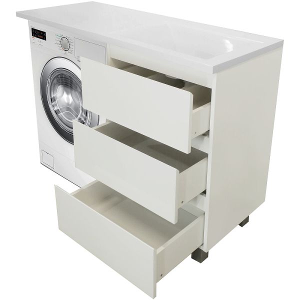 Приоритетом в выборе тумбы с раковиной является площадь ванной комнаты. Функциональная тумба с тремя ящиками решит вопрос для большинства покупателей. Тумба укомплектована раковиной из литьевого мрамора с удобной чашей, стиральная машина устанавливается под столешницей. Три ящика позволят распределить как крупные, так и мелкие вещи.