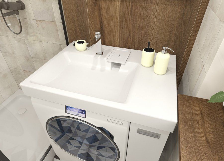 Простые и четкие линии тумбы идеально впишутся в интерьер в стиле «минимализм», а компактная раковина из литьевого мрамора установленная над стиральной машиной, позволяет сэкономить место в ванной комнате.