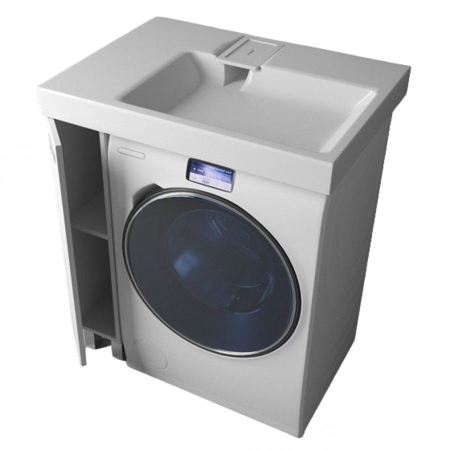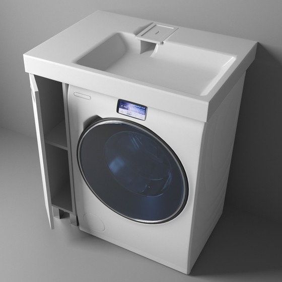 Простые и четкие линии тумбы идеально впишутся в интерьер в стиле «минимализм», а компактная раковина из литьевого мрамора установленная над стиральной машиной, позволяет сэкономить место в ванной комнате.