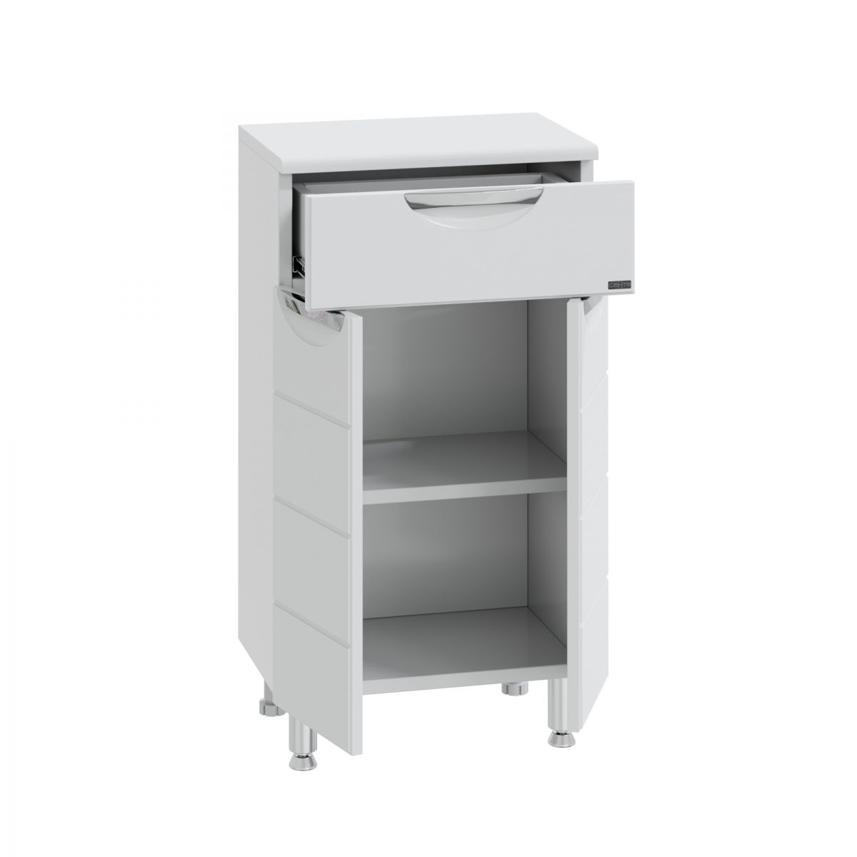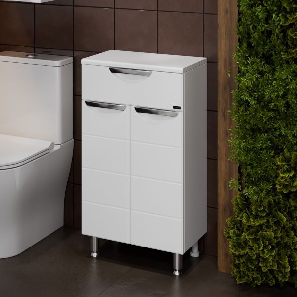 Комплектация: Ручка хром - 3, выдвижной ящик - 1, на дверках петли плавного закрывания, ножка хром - 2, ножка пластик - 2 Тумба напольная СаНта Родос 45 с 1 ящиком напольная предназначена для хранения различных мелочей в ванной комнате. Комод в ванную комнату изготовлен из влагостойких материалов, фасад и столешница комода для ванны изготовлена из МДФ, корпус из влагостойкого ЛДСП. Комод для ванной комнаты оснащен ящиком полного выдвижения (без плавного закрывания). Ножки у комода для ванны идут в комплекте. Купить комод для ванной комнаты вы можете оформив заказ у нас на сайте. Также вы можете подобрать к комоду тумбу с раковиной из коллекции Родос.