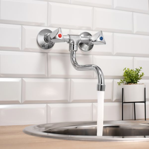 Настенный двуручковый смеситель для кухни из данной серии обладает не отполированным хромированным корпусом и полированным изливом, удобен и практичен в использовании.