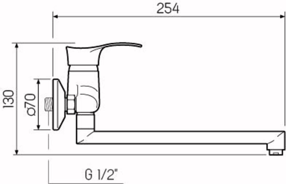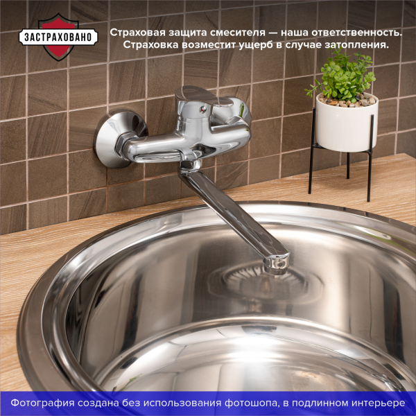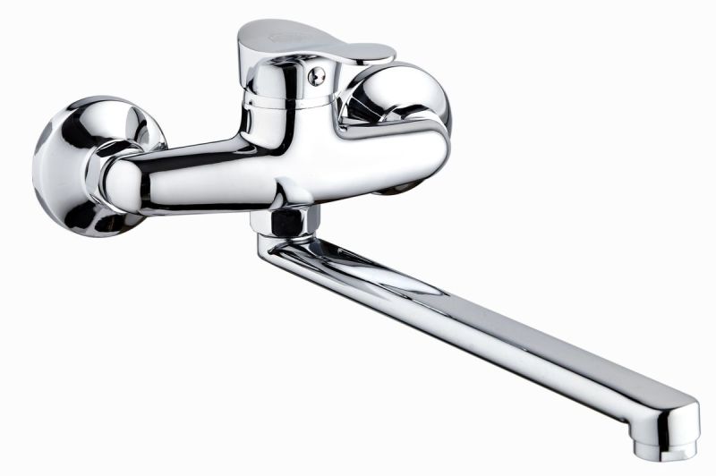 Настенный однорычажный смеситель для кухни с длинным поворотным изливом. Хромовое покрытие, четкие линии, гармоничность устройства станут отличным решением для оборудования вашей кухни.