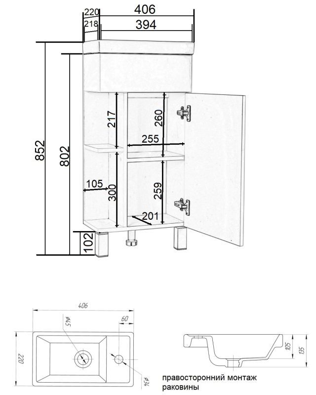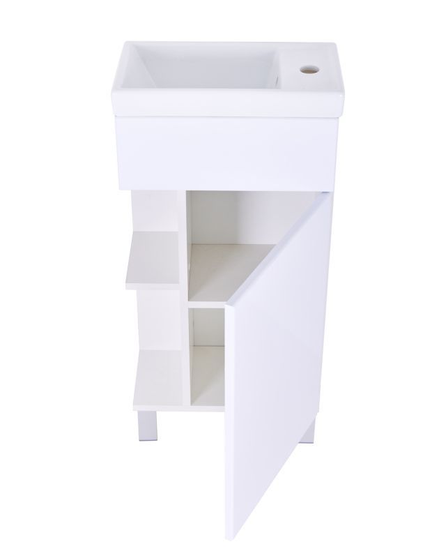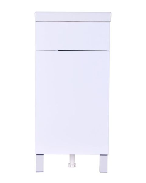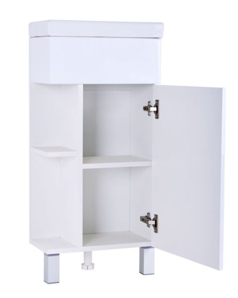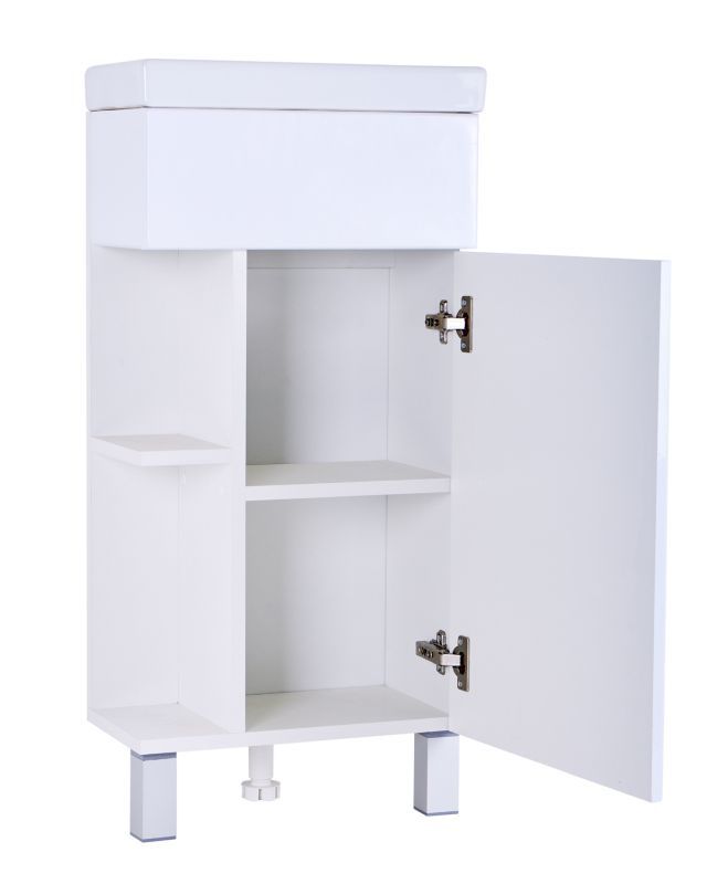 Тумба с раковиной Orange Мини, 40 см, напольная, белый, Mini2-40TUW+RaТумба напольная с раковиной правосторонняя (петли справа) Orange МИНИ отличается дизайном в стиле минимализм. Предназначена для использования в помещениях с повышенной влажностью. Дверца с механизмом доводчика, обеспечивающим плавное закрывание. Материал фасада МДФ - белый глянец, материал корпуса ЛДСП - белый матовый. Раковина Енисей 40 (отверстие под смеситель справа), материал фаянс, встроенный слив-перелив. Тумба поставляется в разобранном виде. В комплекте н-р ножек (3 шт).Комплектация: тумба, к-т ножек, полки, раковина, инструкция.