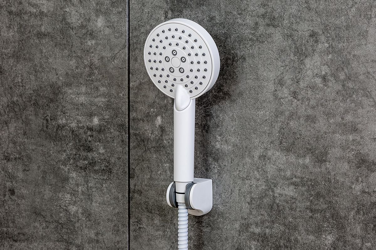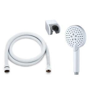 Душевой набор глянцевый белый: ручной душ d 110 мм., 3 режима струи, с силиконовыми наконечниками (защита от известкового налета RUB CLEAN), с системой AIR IN; настенный держатель ручного душа с регулировкой угла наклона (в шести позициях); душевой шланг 150 см в металлической оплетке, с защитой от перекручивания.