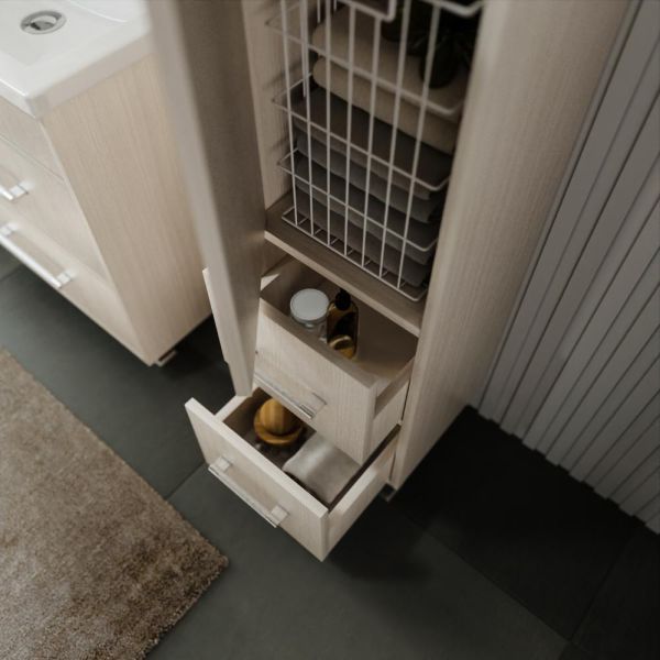 Основное преимущество шкаф-пенала заключается в его вместительности. Удобные полки и ящики позволяют организовать пространство и разместить все необходимое: от косметики до бытовых принадлежностей. Каждая деталь продумана для удобства использования, что делает утренние и вечерние ритуалы более приятными.