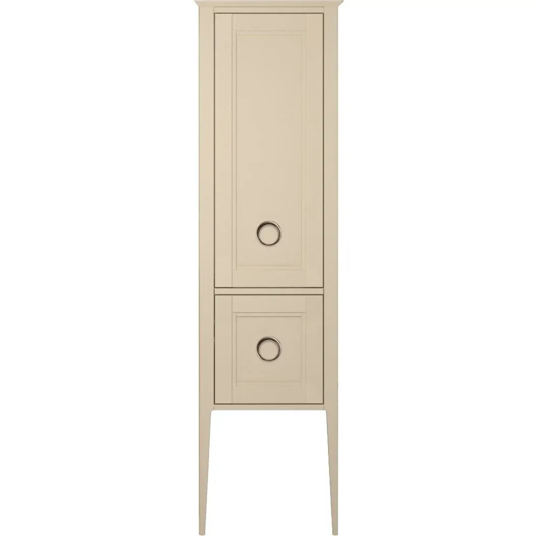 Высокий напольный пенал из массива ясеня с эффектом открытой поры, с распашной дверцей и выдвижным ящиком. Фасад украшен классической фурнитурой. Пространство за дверцей разделено несколькими регулируемыми полками. Петли для крепления дверцы расположены справа.
