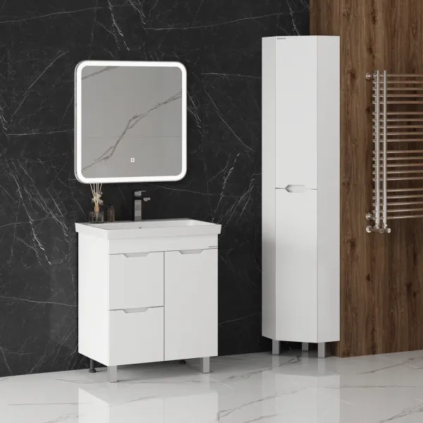 Пенал имеет два отделения за распашными дверцами с доводчиками, полки внутри регулируются по высоте. Ручки, изящно интегрированные в фасады, позволяют сделать эксплуатацию мебели более удобной и практичной.