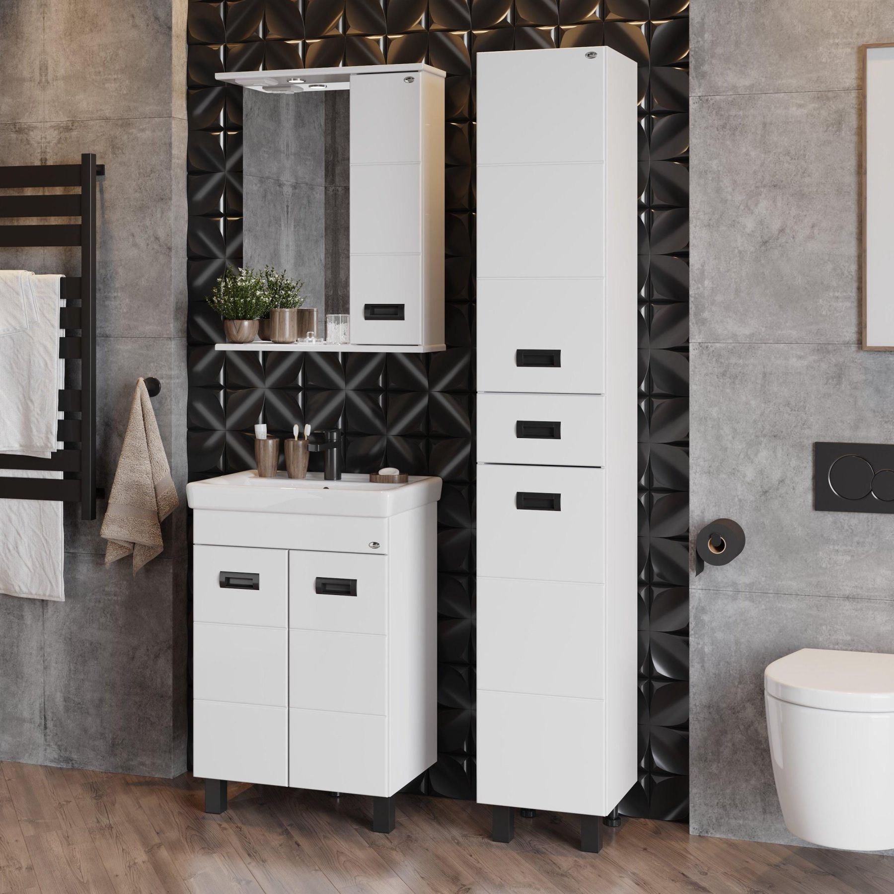 Удобный ящик с направляющими полного выдвижения посередине пенала и два больших отделения, разделенные горизонтальными полочками, за распашными дверями с механизмом плавного закрывания - отличное место для хранения необходимых вещей.