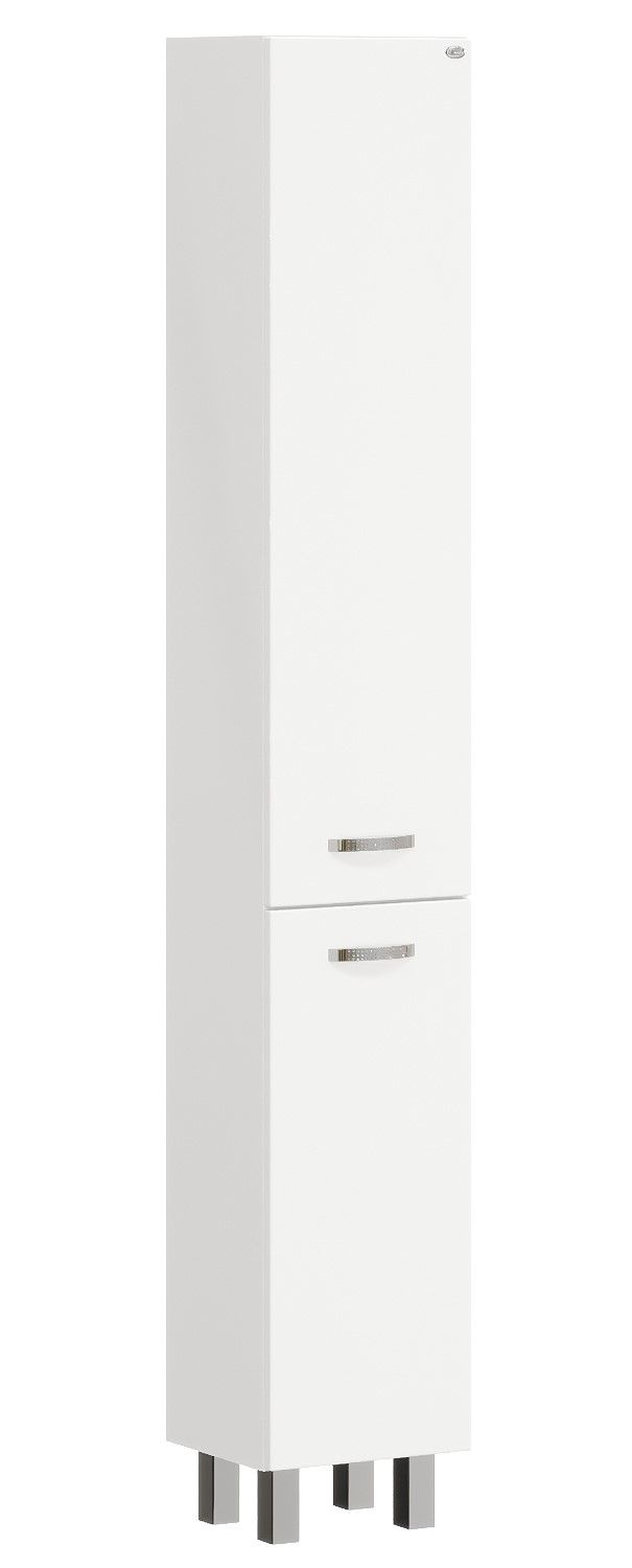 Белый глянцевый цвет, строгие формы без декора и дизайнерские хромированные ручки на двух распашных дверях с механизмом плавного закрывания скрывают просторное внутреннее пространство для размещения необходимых бытовых принадлежностей.