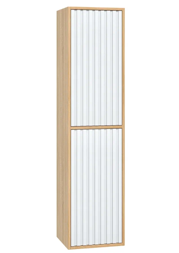 Рифленый белый матовый фасад с покрытием SoftTouch и корпус цвета дуба с роскошной текстурой подчеркнет изысканный вкус владельца и станет центральным элементом декора.