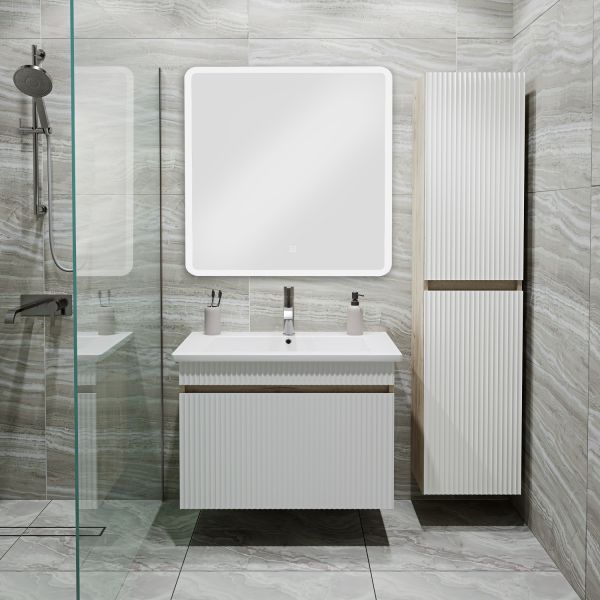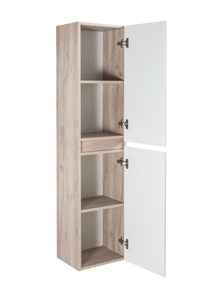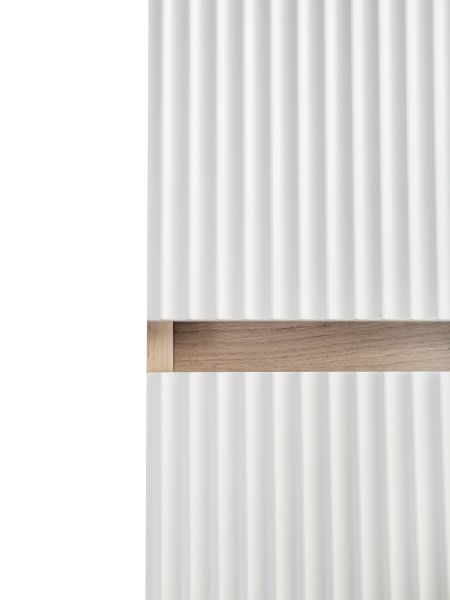 Шкаф пенал для ванной комнаты RUNO МОДЕНА (подвесной) – это изысканность и утончённая роскошь в интерьере. Волнистые рифленые фасады визуально «оживляют» и «приводят в движение» всю обстановку комнаты, сохраняя при этом умиротворение и покой, превосходно сочетаются с древесной фактурой и текстурой необработанного натурального камня корпуса. Цвет корпуса в двух цветах: текстура светлого дерева или необработанного натурального камня. Цвет фасада классический – белый глянец, идеально впишутся в любой интерьер ванной комнаты. Шкаф в ванную комнату оснащён двумя распашными дверцами, в каждом отделении по одной встроенной полке. Каждая дверца укомплектована двумя петлями, верхняя с доводчиком, нижняя без доводчика. Мебель для ванной RUNO - красота и практичность в мелочах, шкаф пенал для ванной комнаты Модена – лучший выбор для Вашей ванной комнаты!