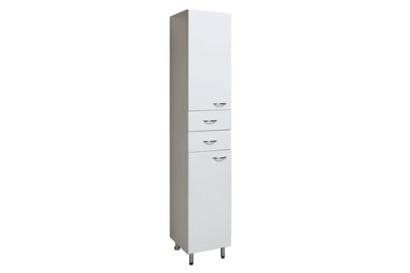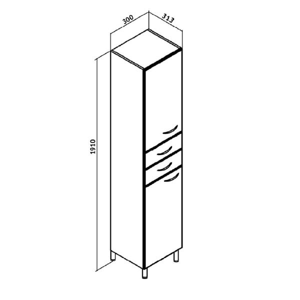 Шкаф-колонна напольный с двумя распашными дверками и выдвижными ящиками. В нижнем и верхнем отделениях - по одной внутренней полке. Ящики - на шариковых направляющих. Петли со встроенным доводчиком, ручки - 4 шт, ножки хром - 2 шт, ножки пластик -2шт.