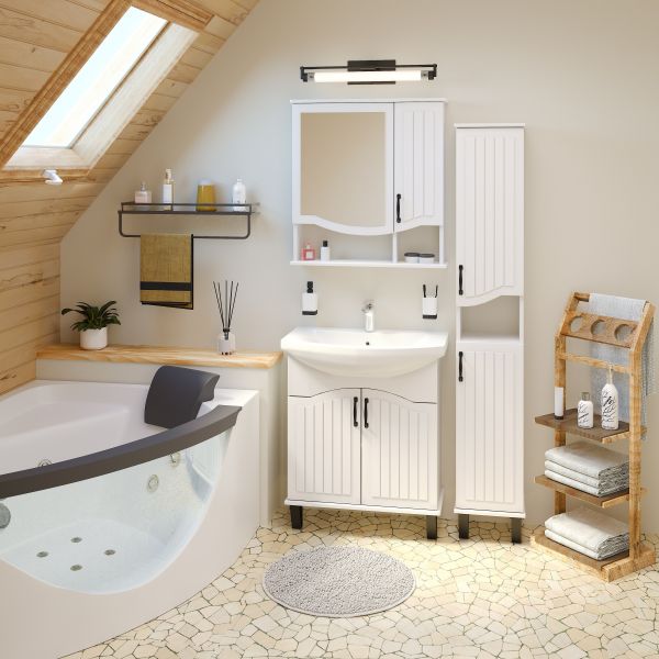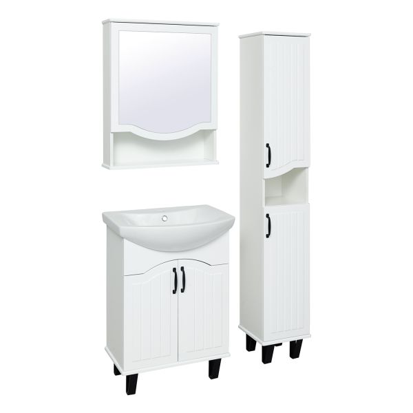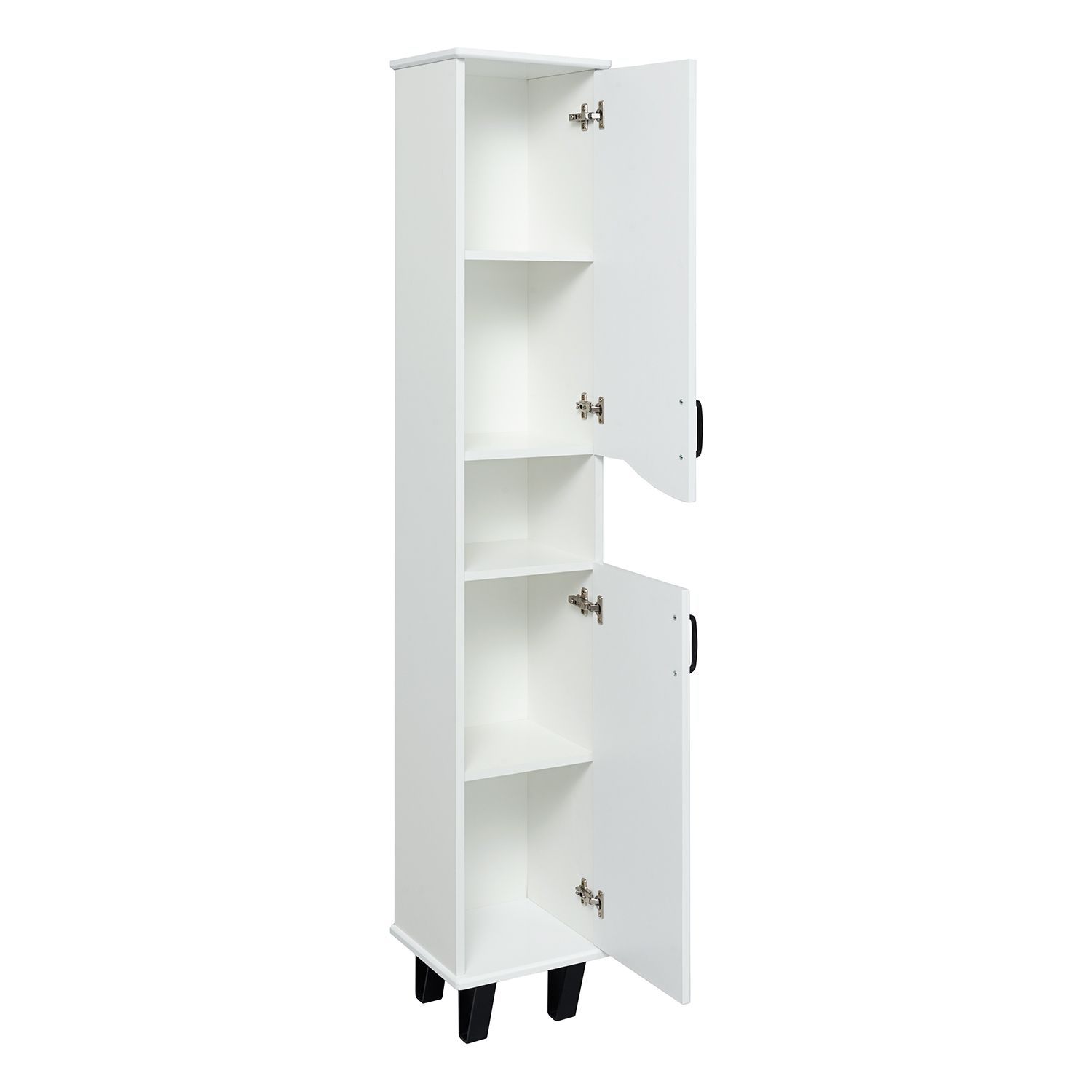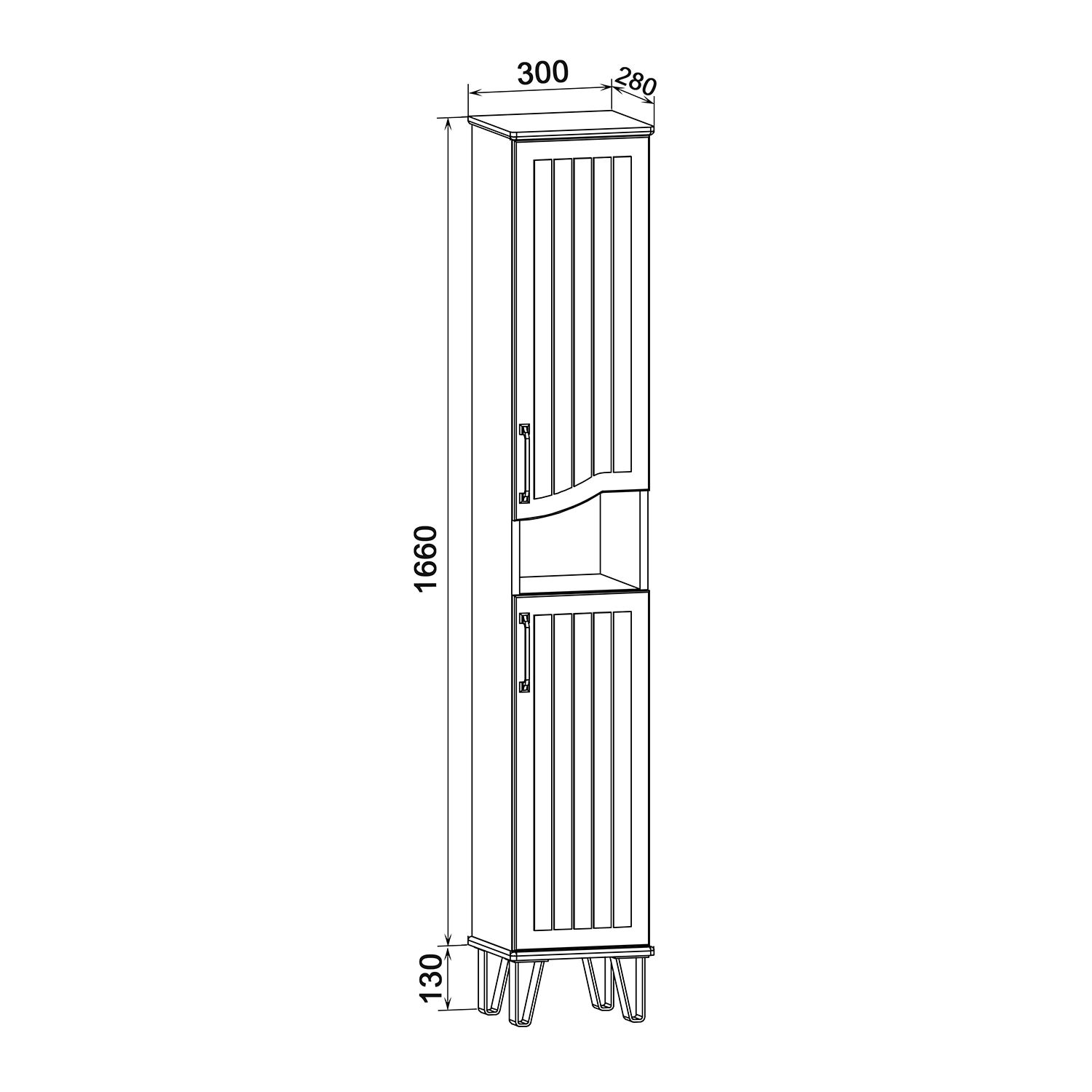 Шкаф-колонна напольный с двумя распашными дверками и открытой нишей посередине. В верхнем и нижнем отделениях по одной встроенной полке. Петли со встроенным доводчиком, ножки черные пластиковые -4шт, ручки черные -2шт. Выпускается только в правом исполнении.