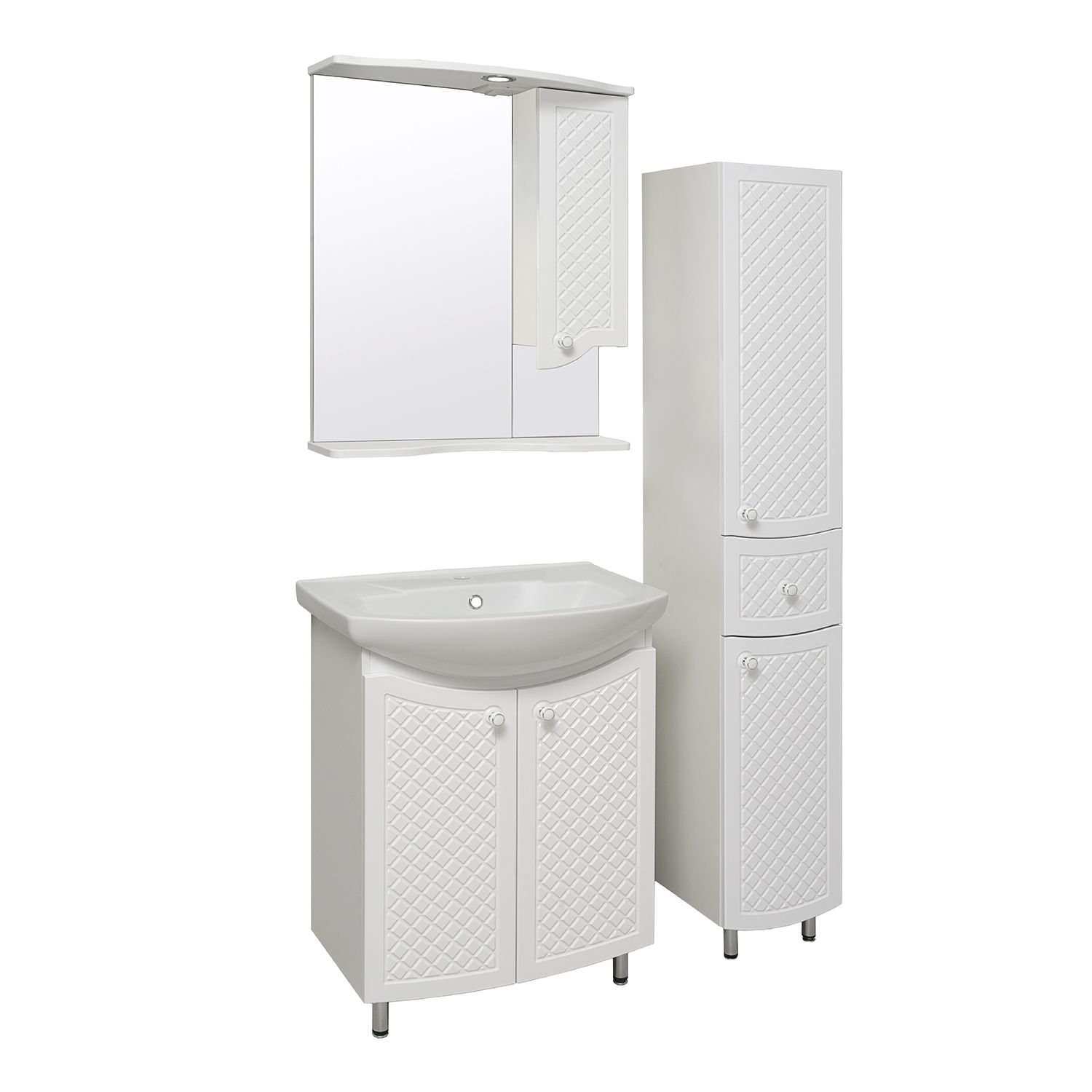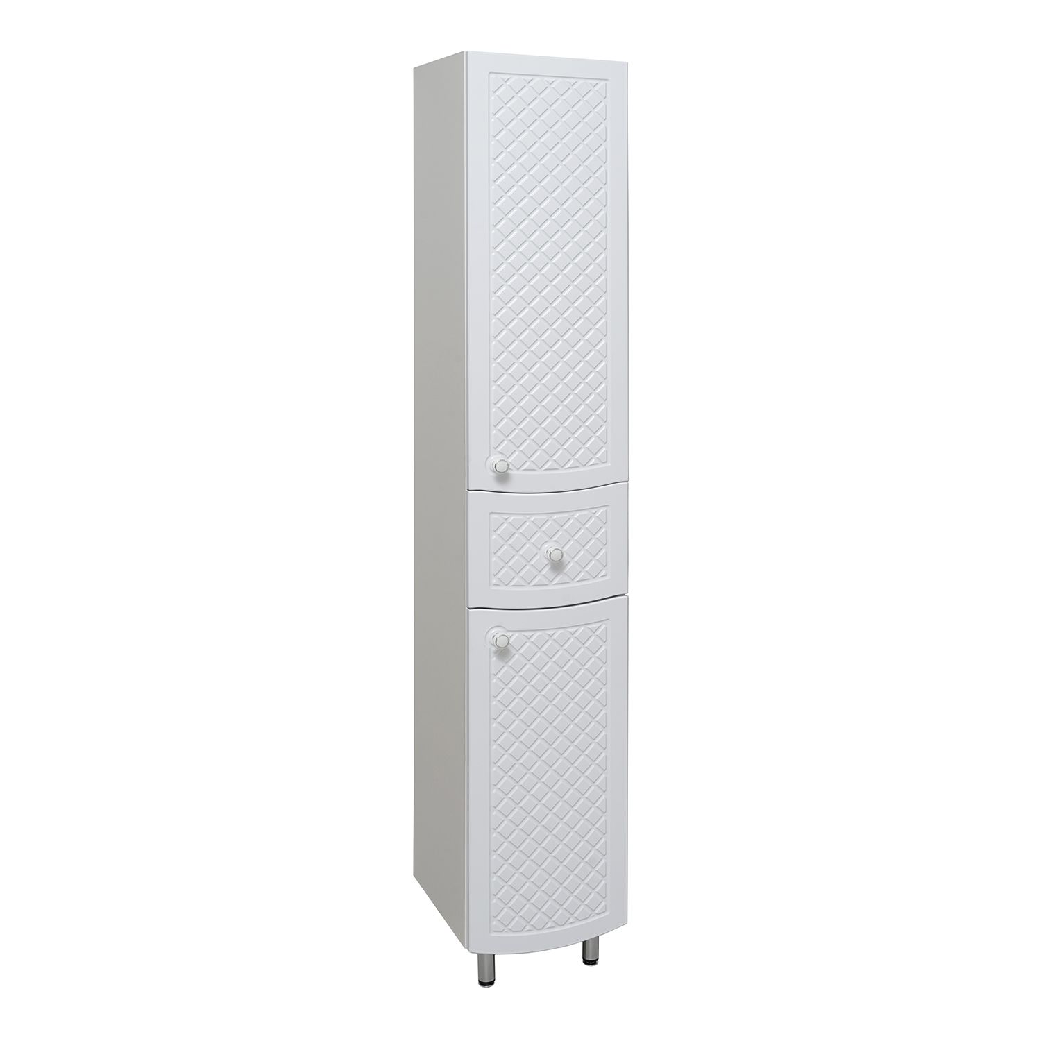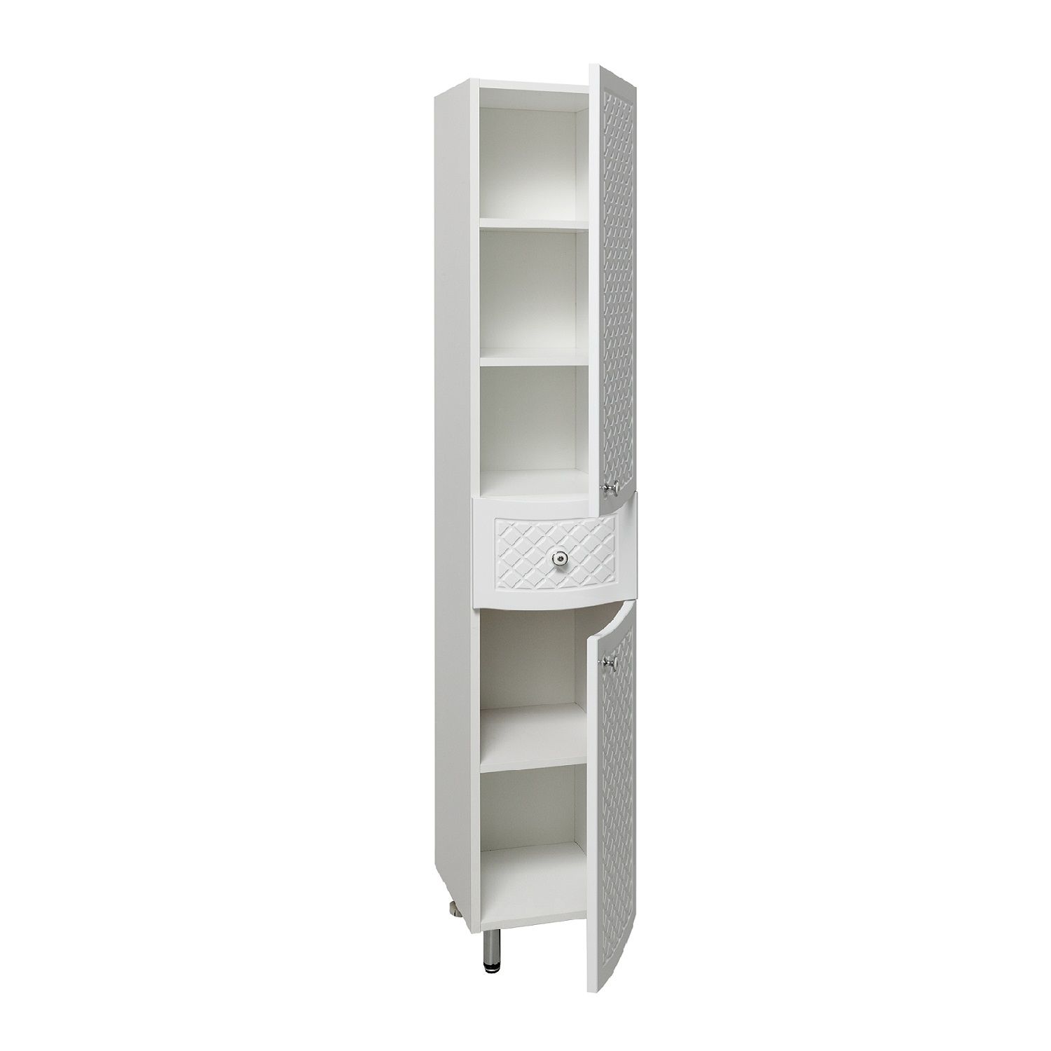 Шкаф-колонна напольный с двумя распашными дверками и выдвижным ящиком посередине. В верхнем отделении - две внутренние полки, в нижнем - одна. Петли со встроенным доводчиком, ящик - на шариковых направляющих полного выдвижения, ручки - 3шт, ножки хром - 2шт, ножки пластик - 2шт. Выпускается только в правом исполнении.