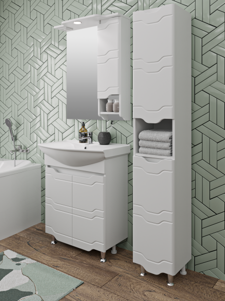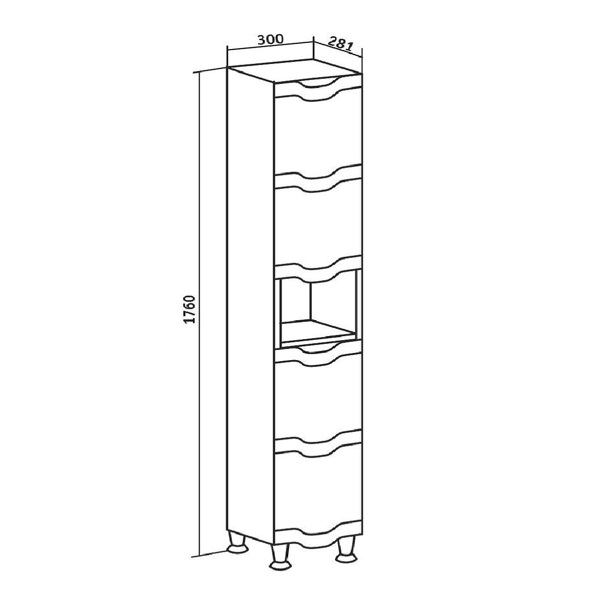 Шкаф-колонна напольный с двумя распашными дверками и открытой нишей посередине. В верхнем отделении - одна внутренняя полка, нижнее отделение комплектуется полкой и корзиной для белья. Петли со встроенным доводчиком, ножки хром - 2шт, ножки пластик -2шт. Выпускается только в правом исполнении.