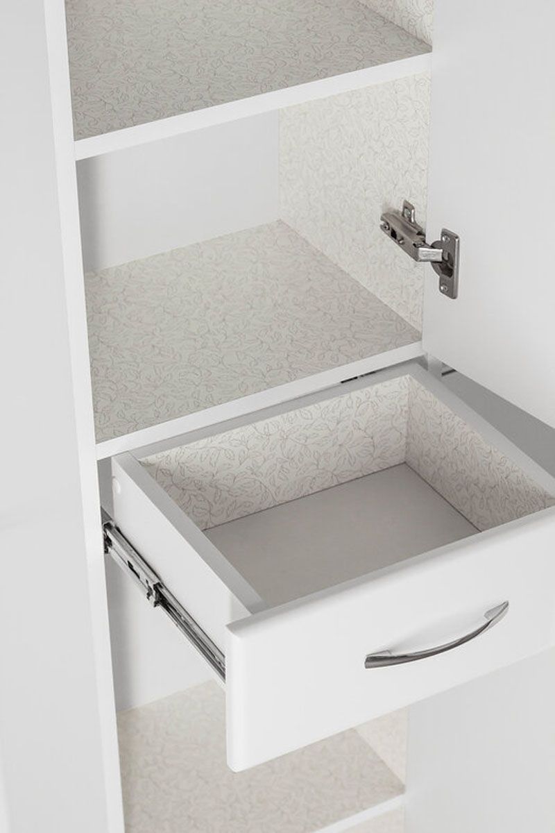 Колонна напольная бренда "Style Line" Эко Стандарт 36. Фурнитура - хром, эксклюзивный декор "Луино" - ламинация внутренней стороны изделия. Направляющие полного выдвижения Hettich; сборка изделия с помощью эксцентриковых стяжек Hafele; все материалы полностью влагостойкие