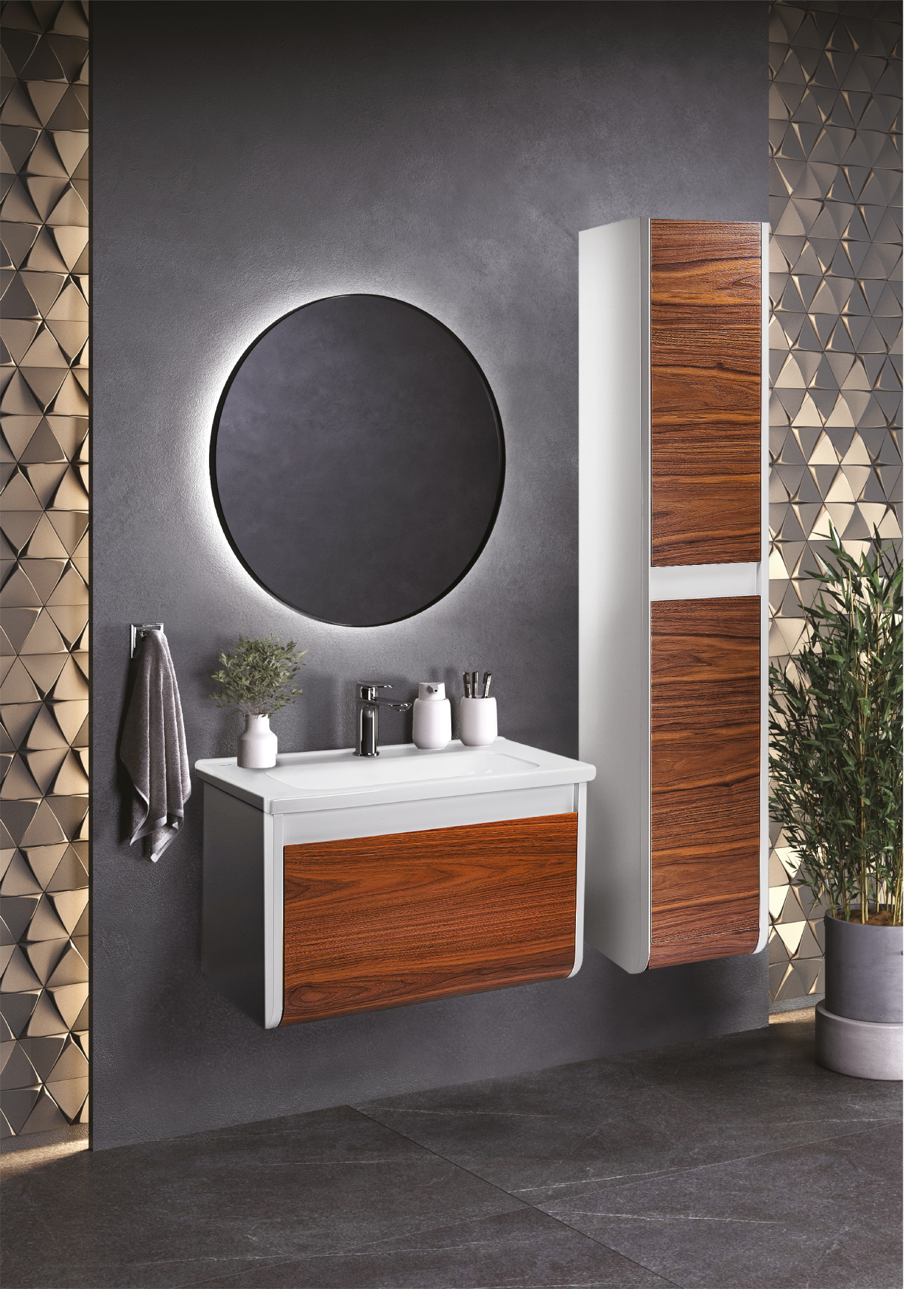 Серия VISION: Модульная система с натуральным шпоном Базовые элементы системы - Напольные пеналы (для бокового монтажа) - Арт. VSN000P-L (Левый): 310 ? 1600 ? 346 мм - Арт. VSN000P-R (Правый): 310 ? 1600 ? 346 мм ----------------------Ключевые характеристики Параметр Значение Конструкция Модульная (комбинируется тумба + пеналы) Корпус Влагостойкий МДФ с эмалевым покрытием Фасад Натуральный шпон лиственных пород Тип установки Подвесной (тумбы), напольный (пеналы) Система хранения 1 выдвижной ящик (в тумбе) + пеналы с полками Толщина МДФ До 20 мм (усиленная прочность) Нагрузка ящика До 40 кг (специальная фурнитура) Поверхность Полуматовая с текстурой древесины Цвета • Фасад: Дуб (натуральный шпон)• Корпус: Белый Фурнитура Полностью выдвижные ящики, регулируемые системы ----------------------Преимущества серии - Высокие пеналы (160 см) для хранения вертикальных предметов.? Гигиеничность: Подвесной монтаж тумб облегчает уборку.