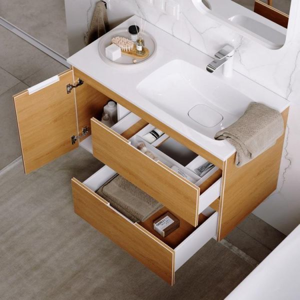 Подвесная тумба под раковину Aqwella Accent ACC0109RDZ 90 смПодвесная тумба с двумя ящиками и одной дверью в цвете дуб золотой с умывальником из литьевого мрамора (чаша справа)