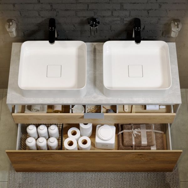 Подвесная тумба под раковину Aqwella Mobi MOB0112BS+MOB0712DB 120 смПодвесная тумба 120 см с двумя ящиками: основной и внутренний, скрытый за фасадом. Цвет бетон светлый/дуб балтийский; с умывальником