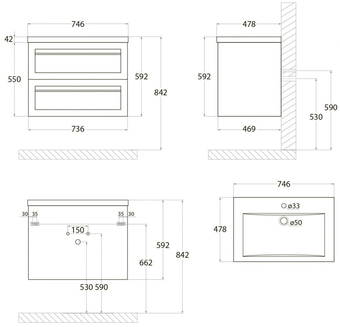 • Рекомендуемая высота от пола: 842 мм