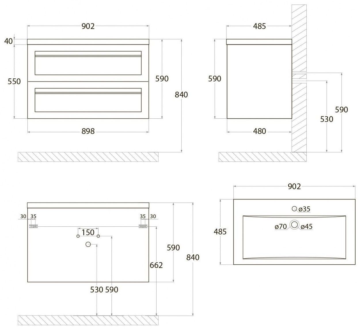 • Рекомендуемая высота от пола: 844 мм