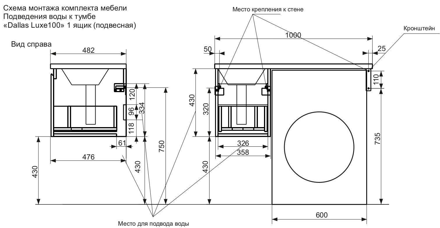 Коллекция мебели для ванной комнаты Dallas Luxe покоряет своей удивительной простой и функциональностью. Стиральная машина устанавливается под столешницей, за счет чего экономит место в ванной комнате. В тумбе имеются два ящика. Нижний ящик тумбы – широкий и вместительный – предназначен для крупных предметов, а в верхнем имеется специальная организация пространства, позволяющая хранить мелкие вещи. Подвесная система монтажа позволяет более эффективно использовать пространство, не мешает уборке в ванной комнате.