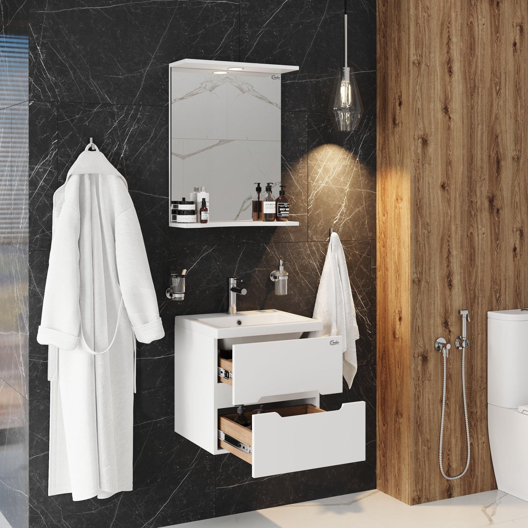 Тумба имеет два ящика с направляющими полного выдвижения: нижний предназначен для больших предметов, а верхний, имеющий удобную систему организации пространства, - для мелких аксессуаров. Ручки, изящно интегрированные в фасады, позволяют сделать эксплуатацию мебели более удобной и практичной.