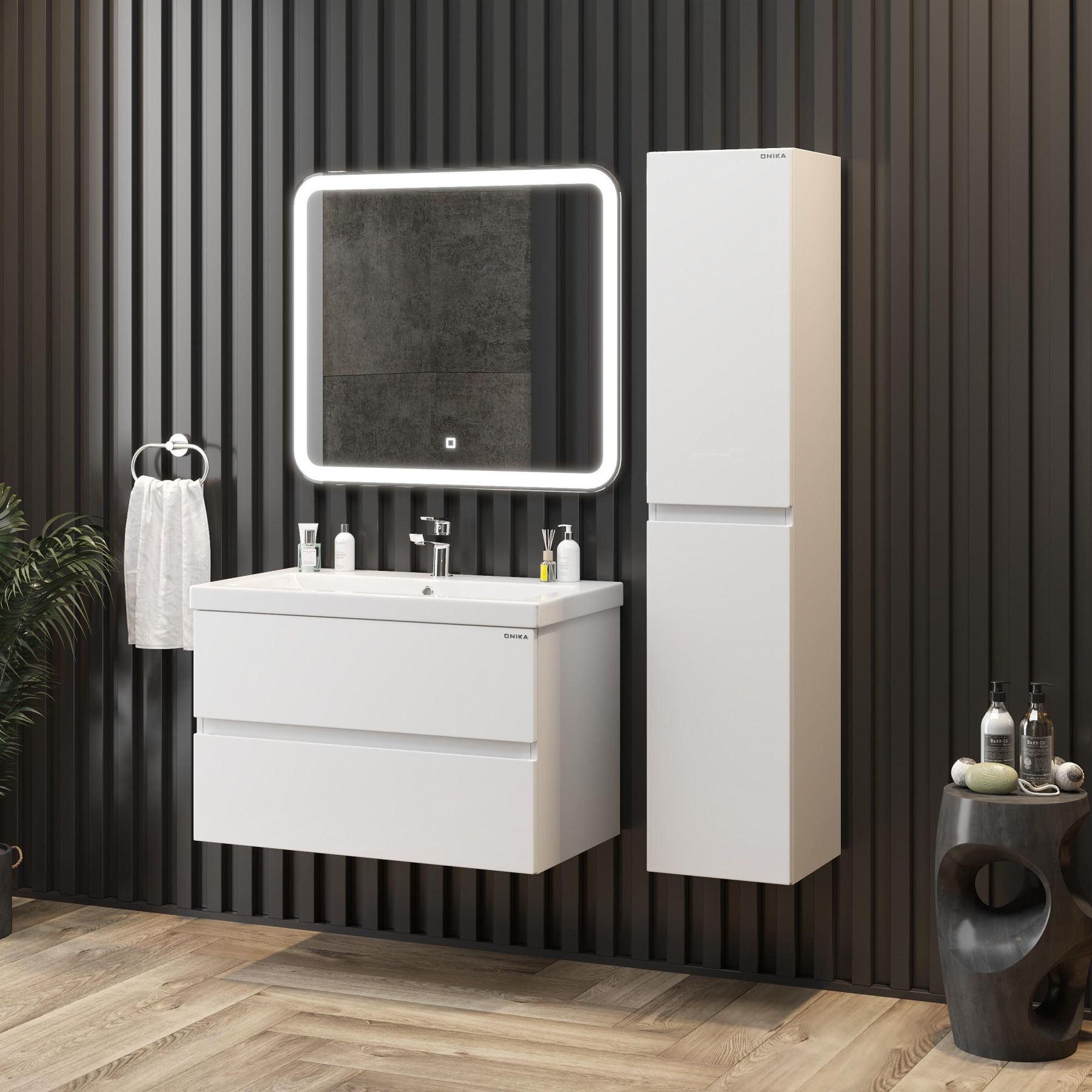Подвесная конструкция значительно упрощает процесс уборки в ванной комнате, а ручки, изящно интегрированные в фасады, позволяют сделать эксплуатацию более удобной и практичной.