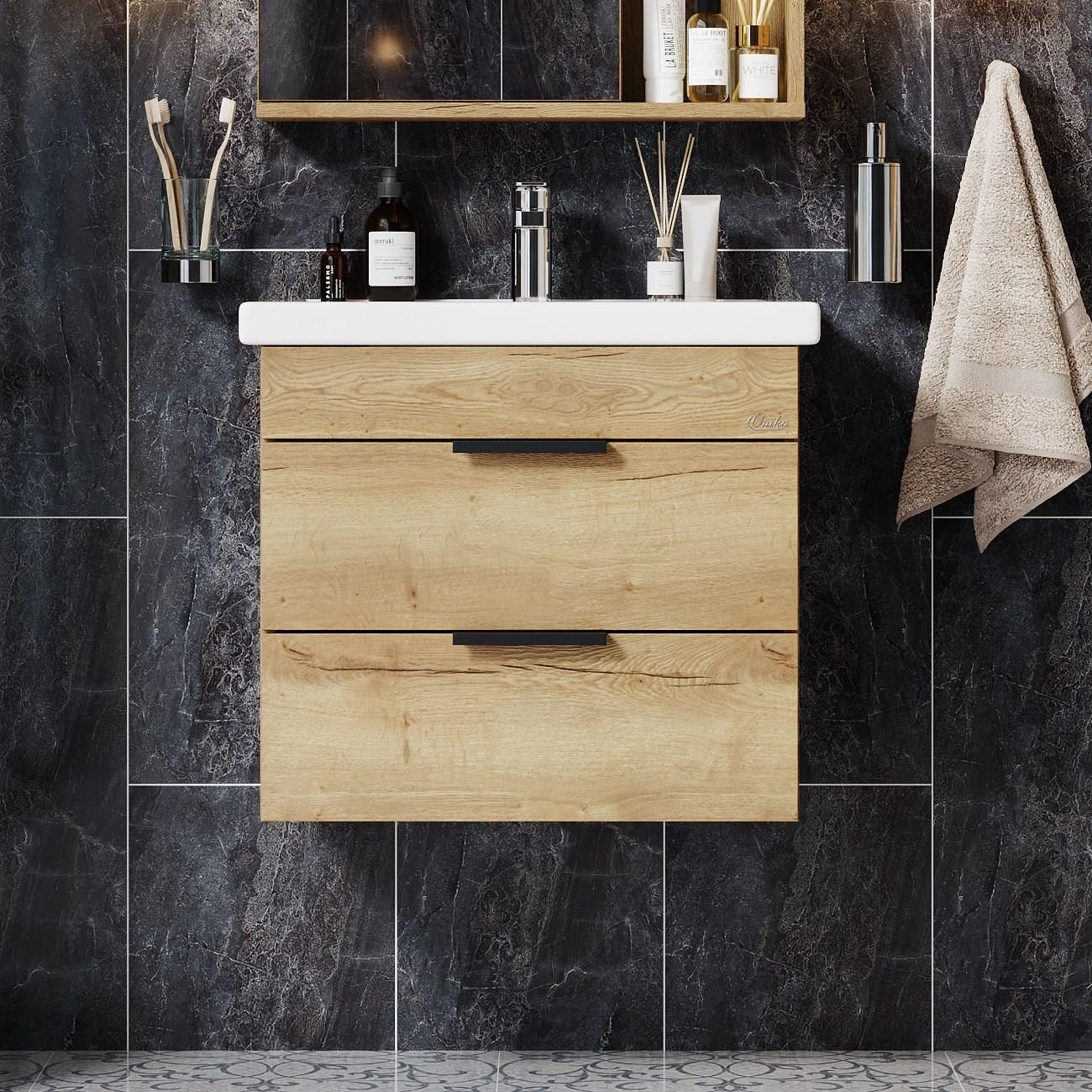 Подвесная тумба для ванной комнаты Onika Легран 50 - это сочетание насыщенного древесного декора и благородства металла: роскошная текстура и натуральный цвет дуба дают теплоту, а матовые металлические ручки добавляют урбанизма и солидности.