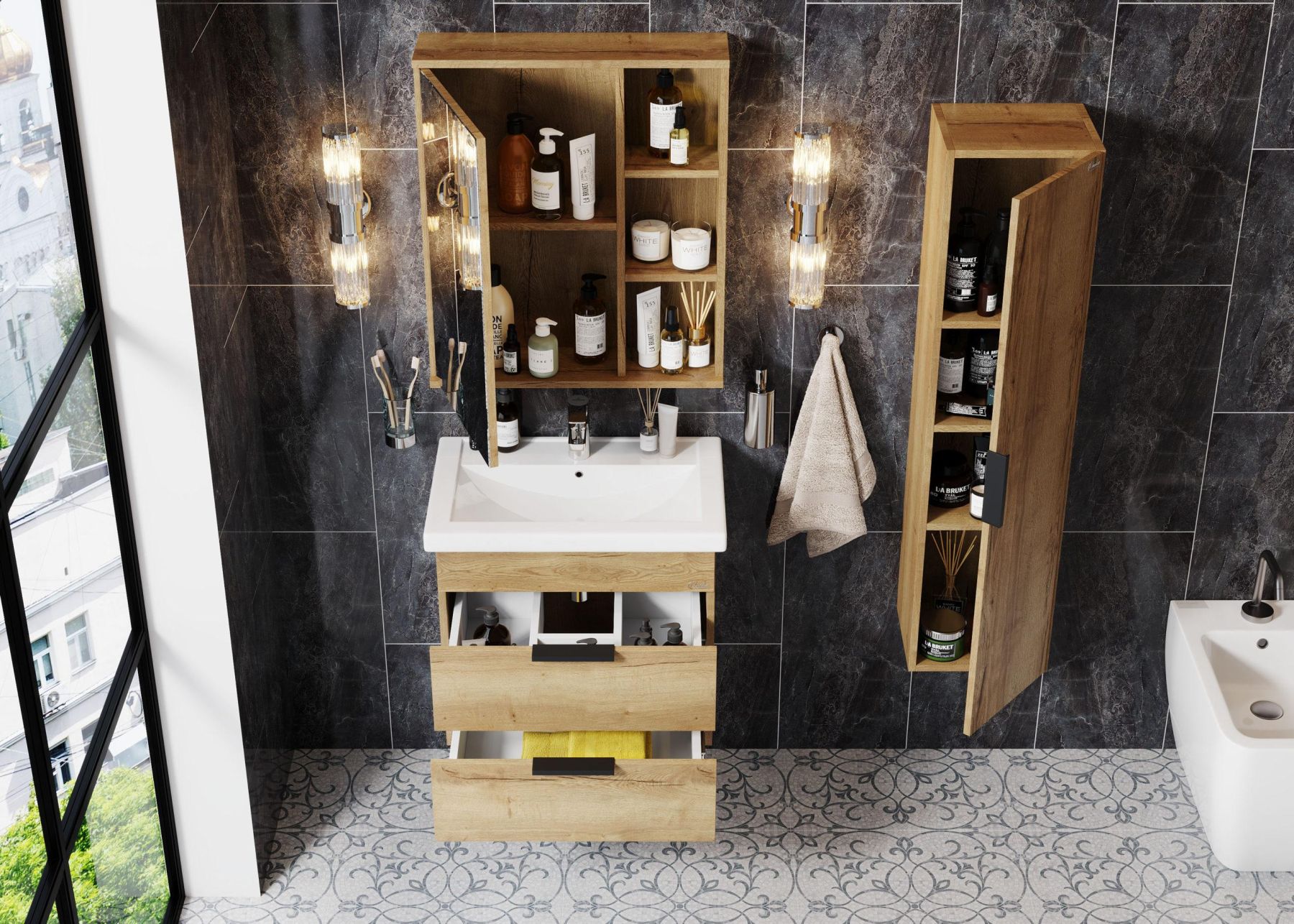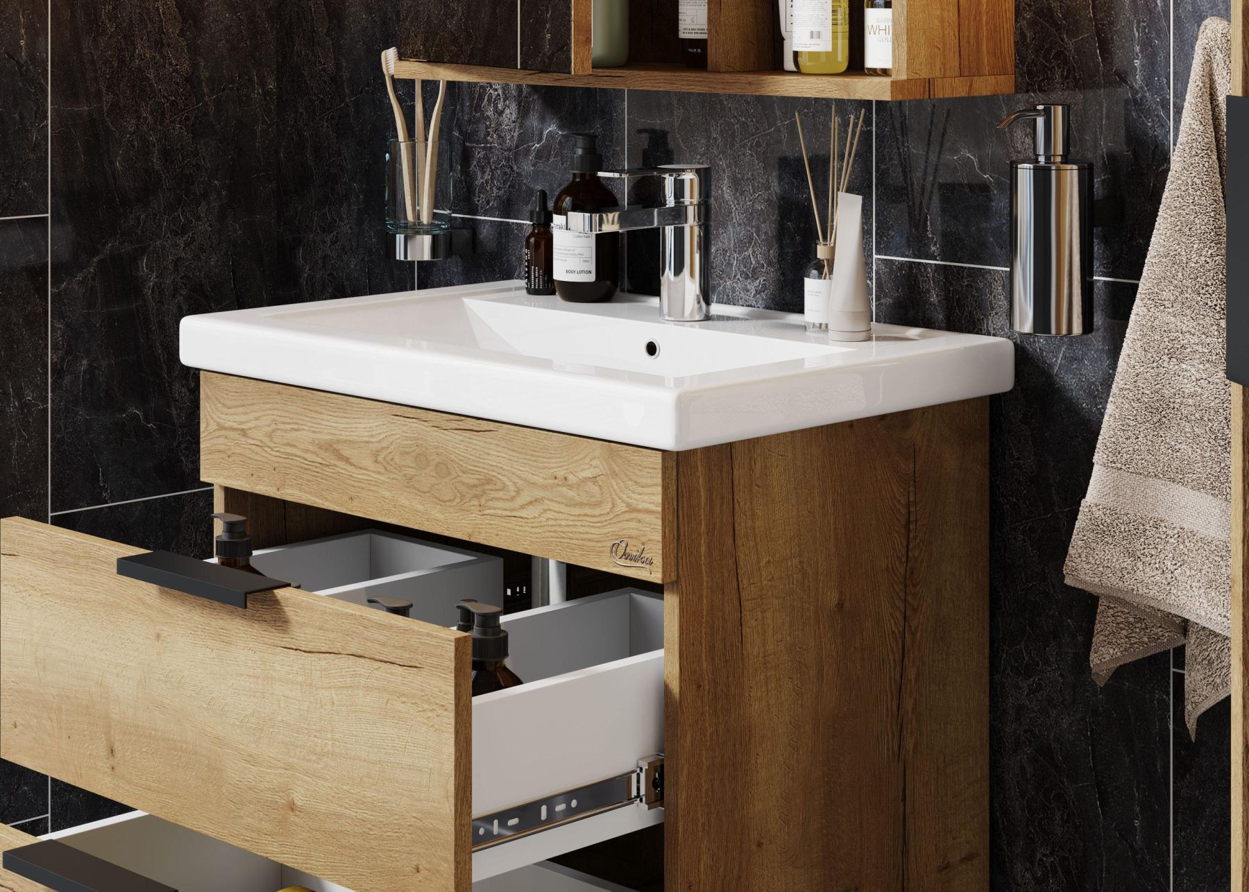 Подвесная тумба для ванной комнаты Onika Легран 60 - это сочетание насыщенного древесного декора и благородства металла: роскошная текстура и натуральный цвет дуба дают теплоту, а матовые металлические ручки добавляют урбанизма и солидности.
