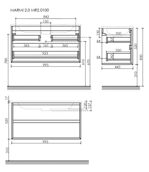 Тумба подвесная SANCOS Marmi 2.0 995х445х520 c двумя ящиками оснащенным доводчиками скрытого монтажа с системой Soft close (плавного закрывания), c фрезерованными ручками по всей длине фасада, цвет дуб галифакс натуральный, арт. MR2.0100EG