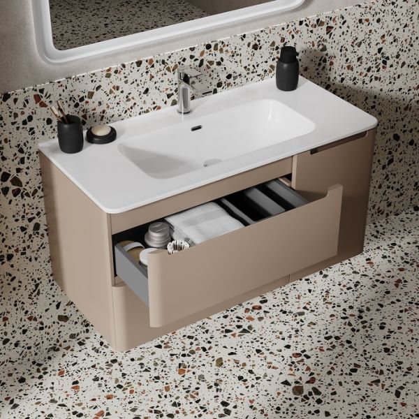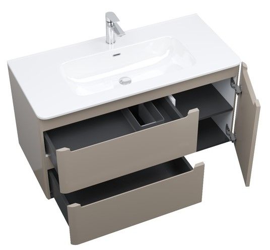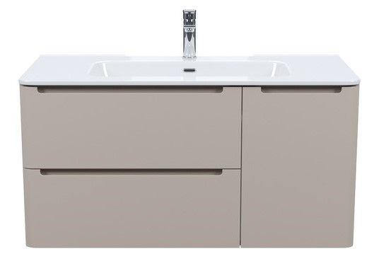 Вместительная подвесная тумба с плоским умывальником Edifice в теплом оттенке капучино – воплощение современного минимализма. Мягкие линии корпуса в сочетании с удобными интегрированными ручками выглядят свежо и актуально. Смотрится аккуратно, легко и не усложняет процесс уборки в ванной благодаря подвесной конструкции.
