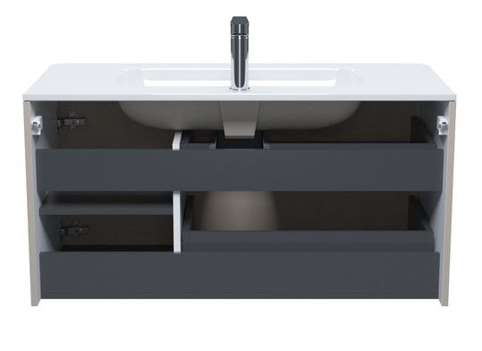 Два выдвижных ящика закрываются плавно и бесшумно благодаря высококачественным скрытым направляющим с доводчиками немецкого производства.