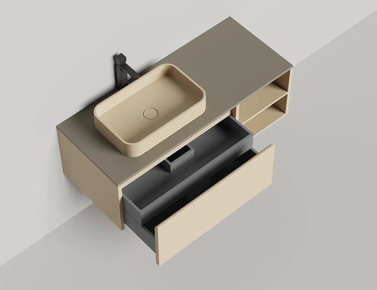 - Тумба и столешница из материала S-Stone в сборе (накладные раковины укомплектованы донным клапаном и поставляются в отдельной коробке)