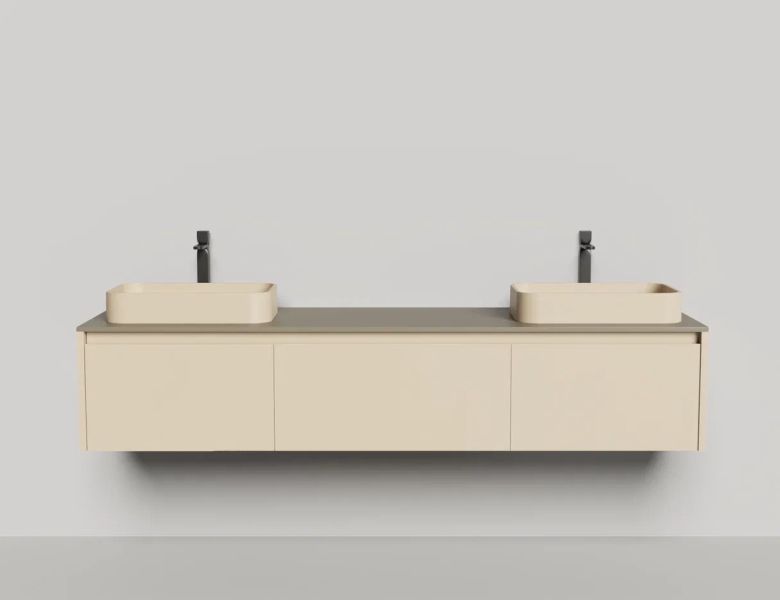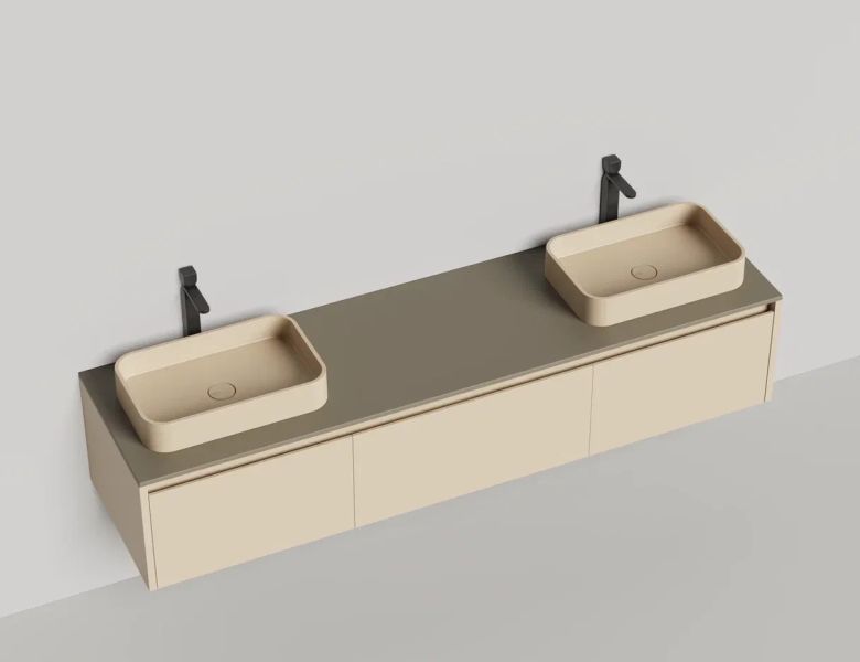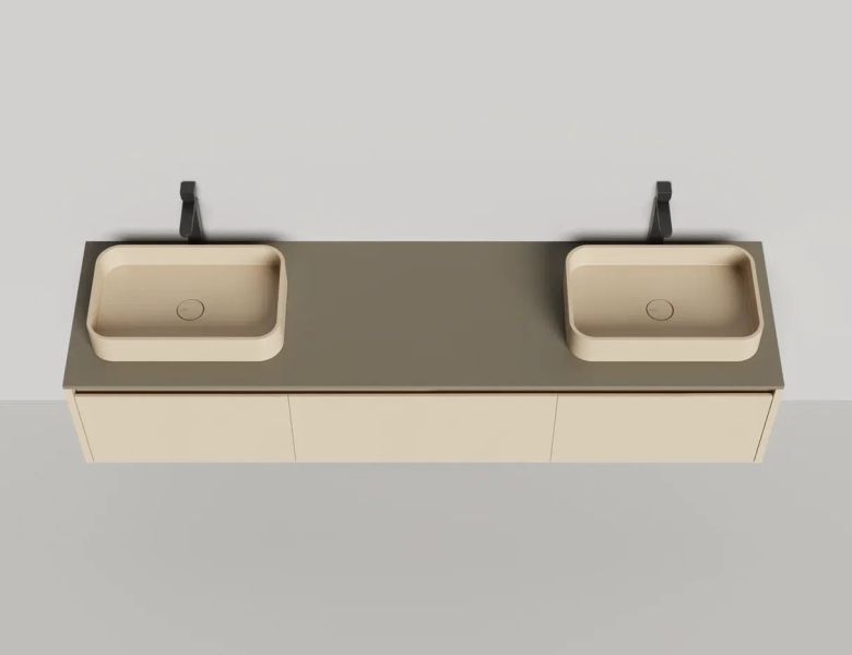 • Тумба и столешница из материала S-Stone в сборе (накладные раковины укомплектованы донным клапаном и поставляются в отдельной коробке)