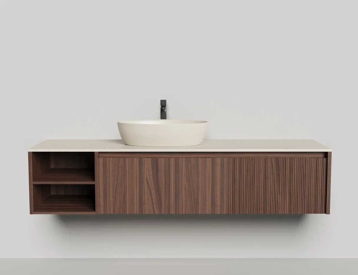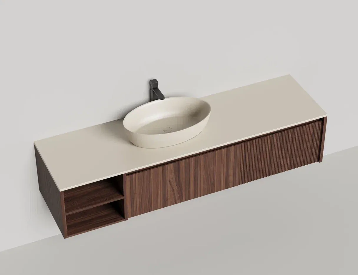 - Тумба и столешница из материала S-Stone в сборе (накладные раковины укомплектованы донным клапаном и поставляются в отдельной коробке)