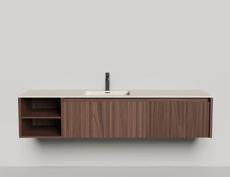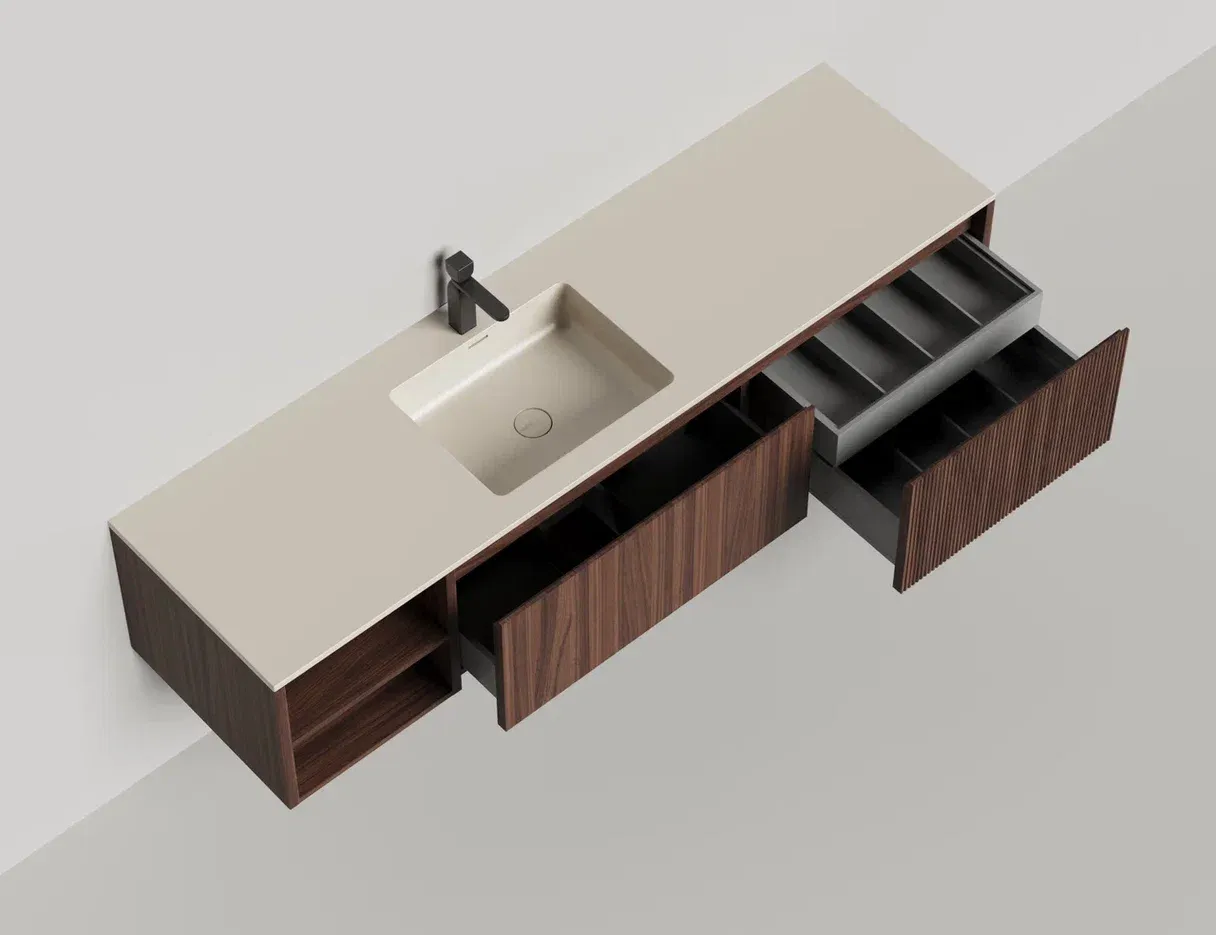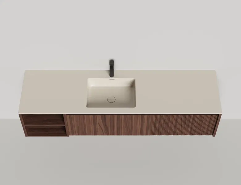 Наполнение для тумбы включает: блоки ячеек для тумб, коврики и комплект внутренней подсветки, которые помогут организовать пространство и создать более удобный доступ к вещам.Тумба DOMINO, дополненная столешницей COSTA из каменного литья S-Stone, гарантирует практичность и простоту ухода.