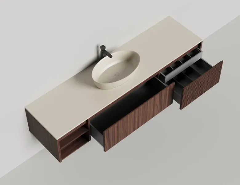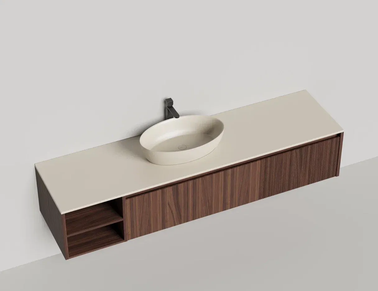 Наполнение для тумбы включает: блоки ячеек для тумб, коврики и комплект внутренней подсветки, которые помогут организовать пространство и создать более удобный доступ к вещам.Тумба DOMINO, дополненная столешницей COSTA из каменного литья S-Stone, гарантирует практичность и простоту ухода.