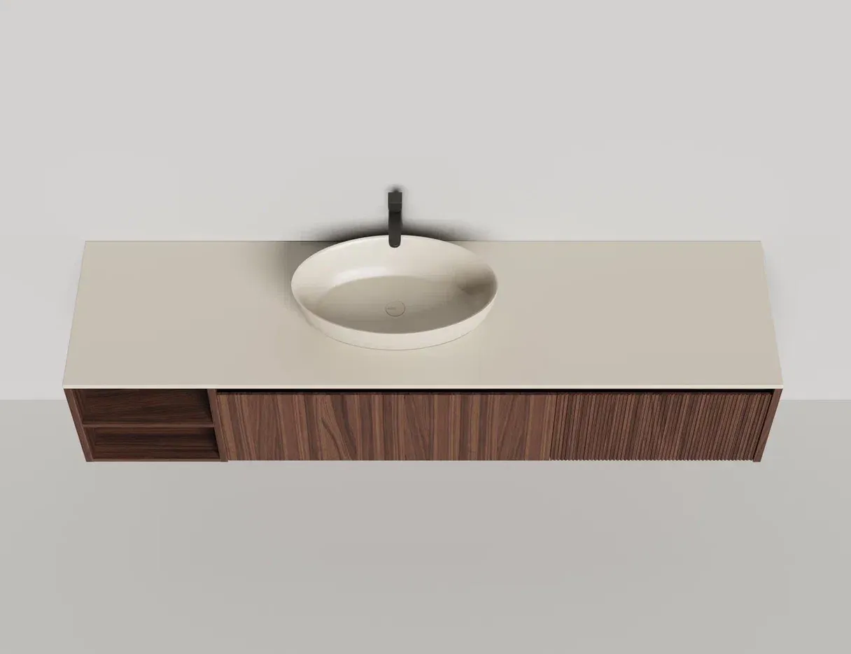• Тумба и столешница из материала S-Stone в сборе (накладные раковины укомплектованы донным клапаном и поставляются в отдельной коробке)