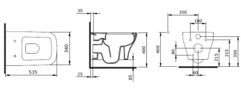 • Прилегание унитаза к стене: