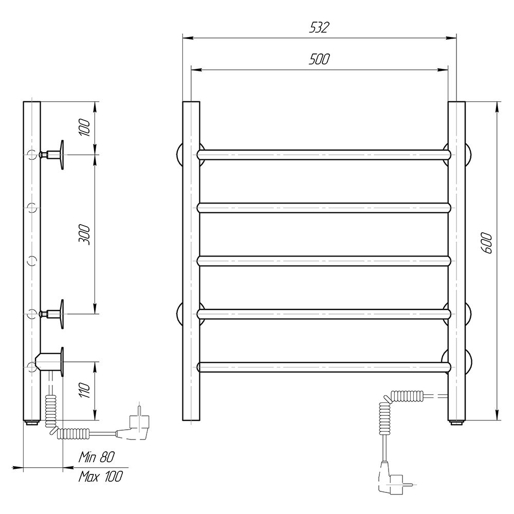 М/о расстояние (межосевое расстояние): 500Количество перекладин: 5Коллекция: АврораТип: электрическиеЦвет: черныйМощность, Вт: 52Ширина (мм): 532Высота (мм): 600Глубина (мм): 80-100Вес: 3,64Объем: 0,0385Тэн/подключение: справаСтрана: РоссияГарантия: 2 года