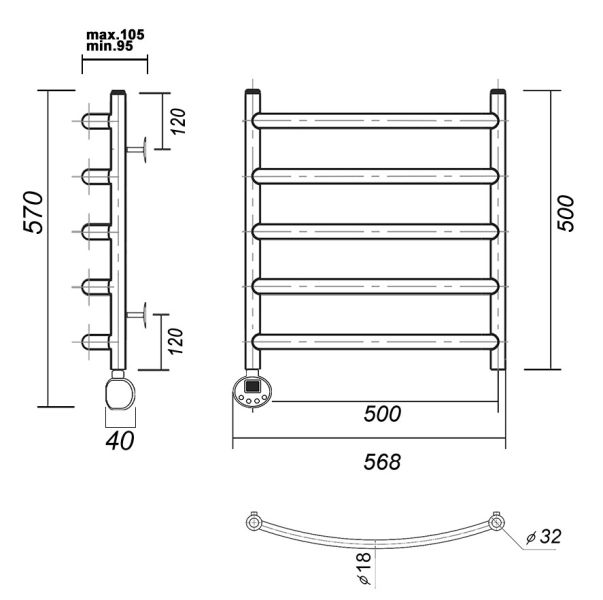 М/о расстояние (межосевое расстояние): 500Количество перекладин: 5Коллекция: КалипсоТип: электрическиеЦвет: золотоМощность, Вт: 300Ширина (мм): 532Высота (мм): 500Глубина (мм): 105-95Вес: 4,9Объем: 0,045375Тэн/подключение: слеваСтрана: РоссияГарантия: 2 года