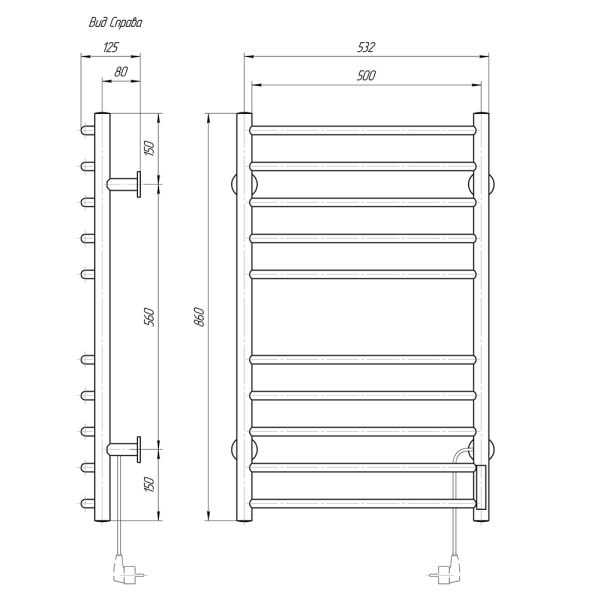 Количество перекладин: 10Коллекция: КлассикТип: электрическиеЦвет: хромМощность, Вт: 100Ширина (мм): 500Высота (мм): 860Глубина (мм): 125Вес: 4,43Объем: 0,043Тэн/подключение: справаСтрана: РоссияГарантия: 2 года