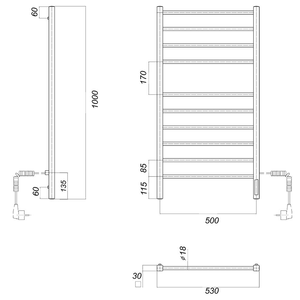 М/о расстояние (межосевое расстояние): 500Количество перекладин: 10Коллекция: КубаТип: электрическиеЦвет: черныйМощность, Вт: 113Ширина (мм): 532Высота (мм): 1000Глубина (мм): 80-90Вес: 6,1Объем: 0,075Тэн/подключение: справаСтрана: РоссияГарантия: 2 года