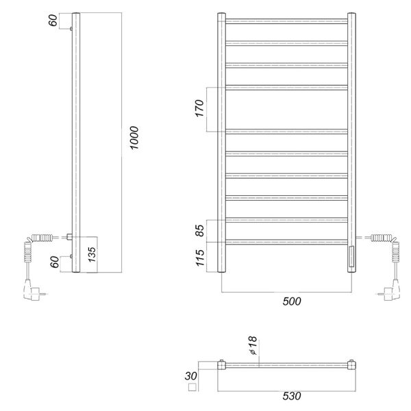Количество перекладин: 10Коллекция: КубаТип: электрическиеЦвет: хромМощность, Вт: 113Ширина (мм): 500Высота (мм): 1000Глубина (мм): 100Вес: 6,1Объем: 0,075Тэн/подключение: справаСтрана: РоссияГарантия: 2 года