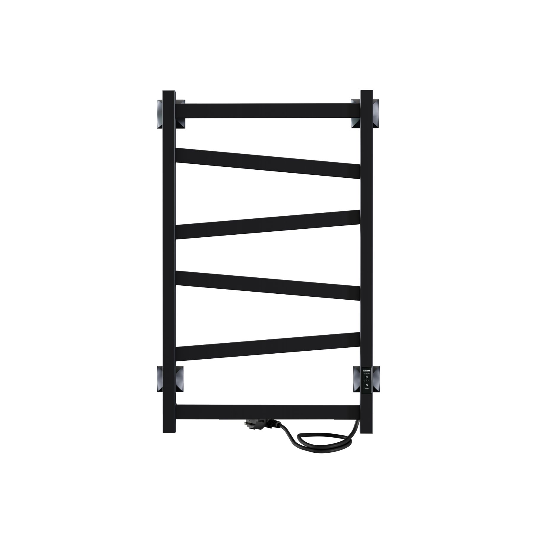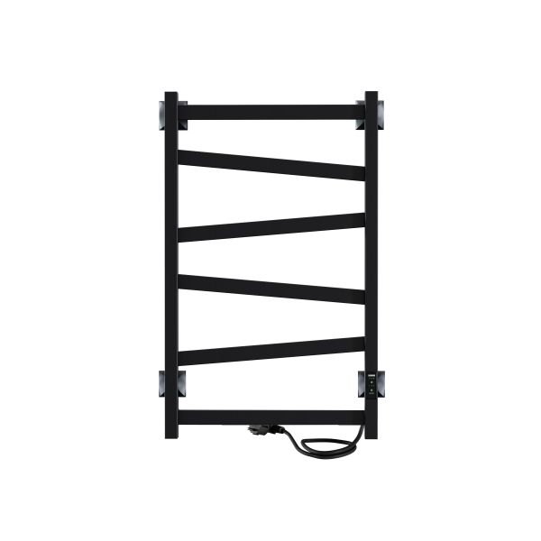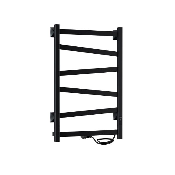 Полотенцесушитель чёрный матовый окрашен безопасной порошковой краской по специальной технологии для придания дополнительной стойкости к повреждениям и устойчивости к воздействию воды и пара. Плюс данной окраски также в том, что на покрытии не остаются отпечатки и разводы, а значит чистота и аккуратный вид сохранится дольше. Благодаря строгим формам электрополотенцесушитель прекрасно впишется в интерьер душевой комнаты или ванной. Особенностью данной модели являются перекладины, расположенные под наклоном.