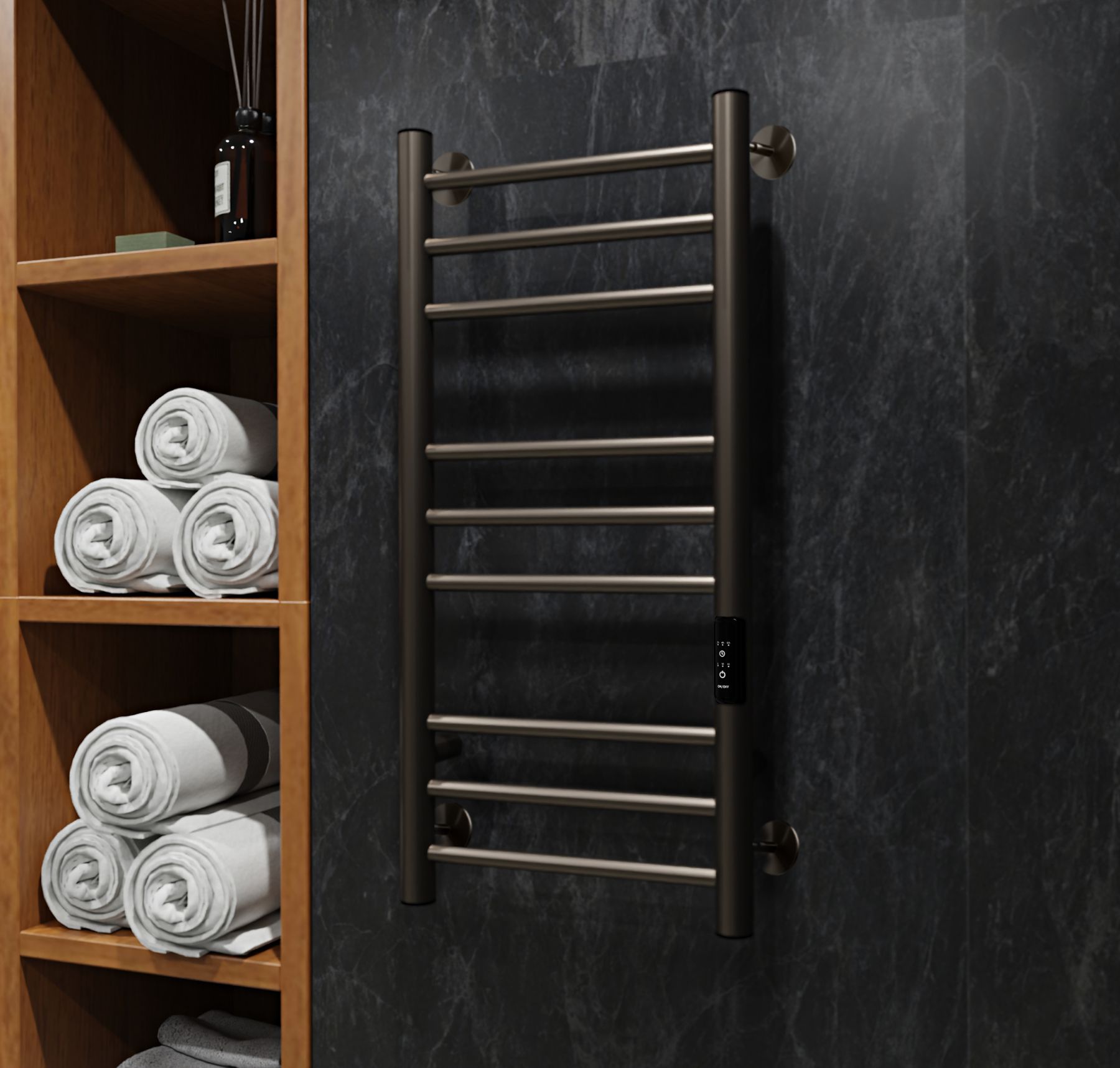 Полотенцесушитель электрический имеет встроенный терморегулятор нагрева, у которого три режима: 40, 45, 50 градусов и таймер на отключение через 2, 4, 6 часов.